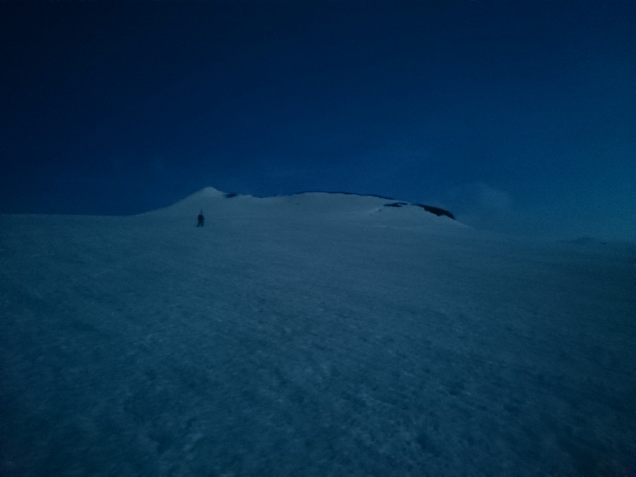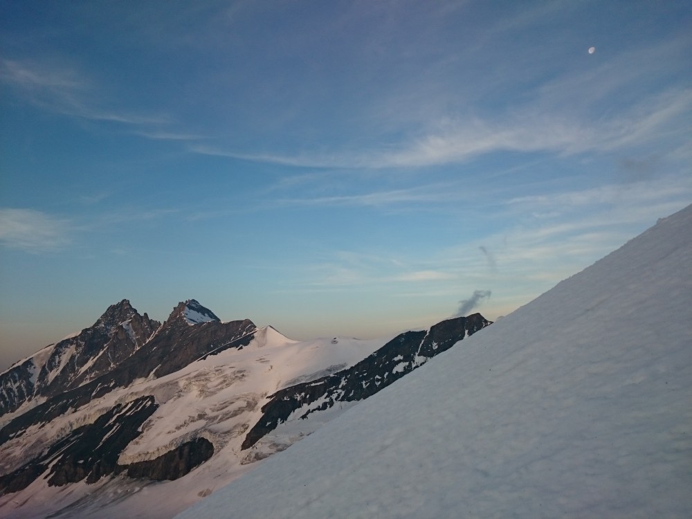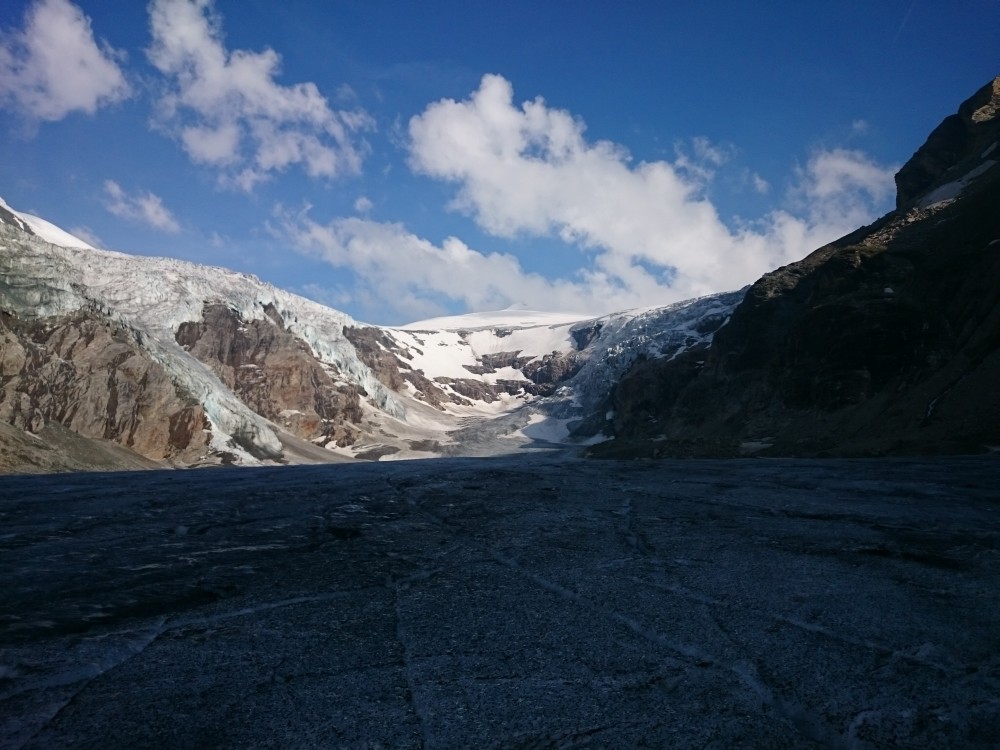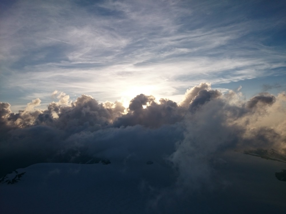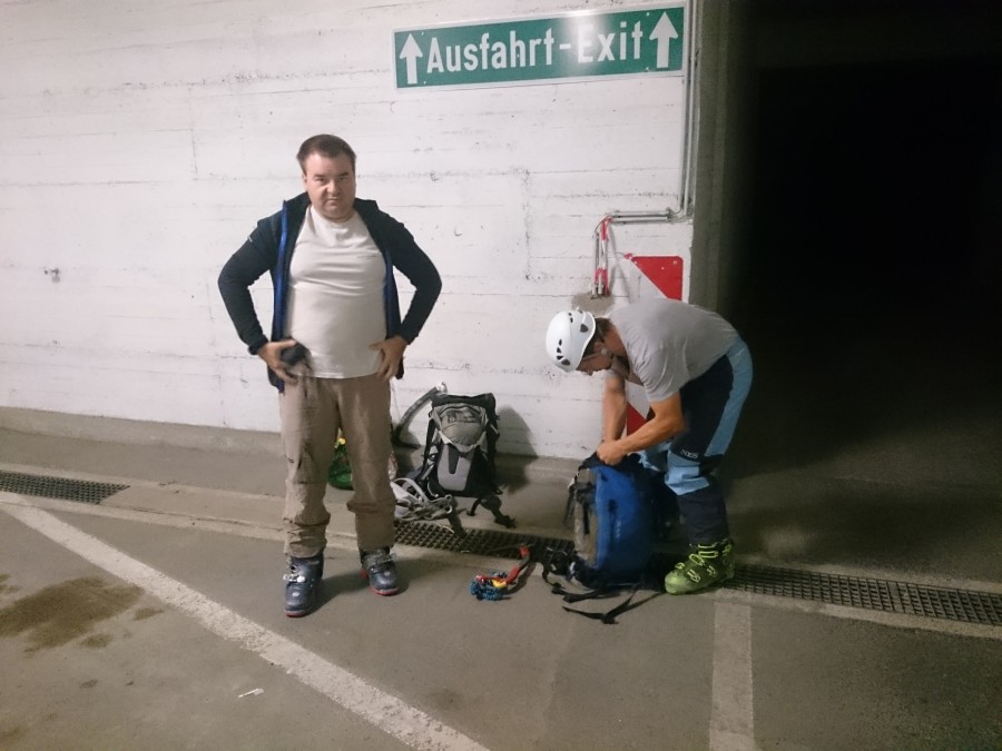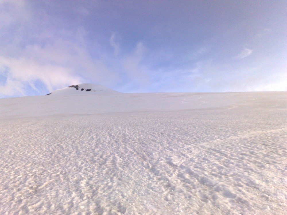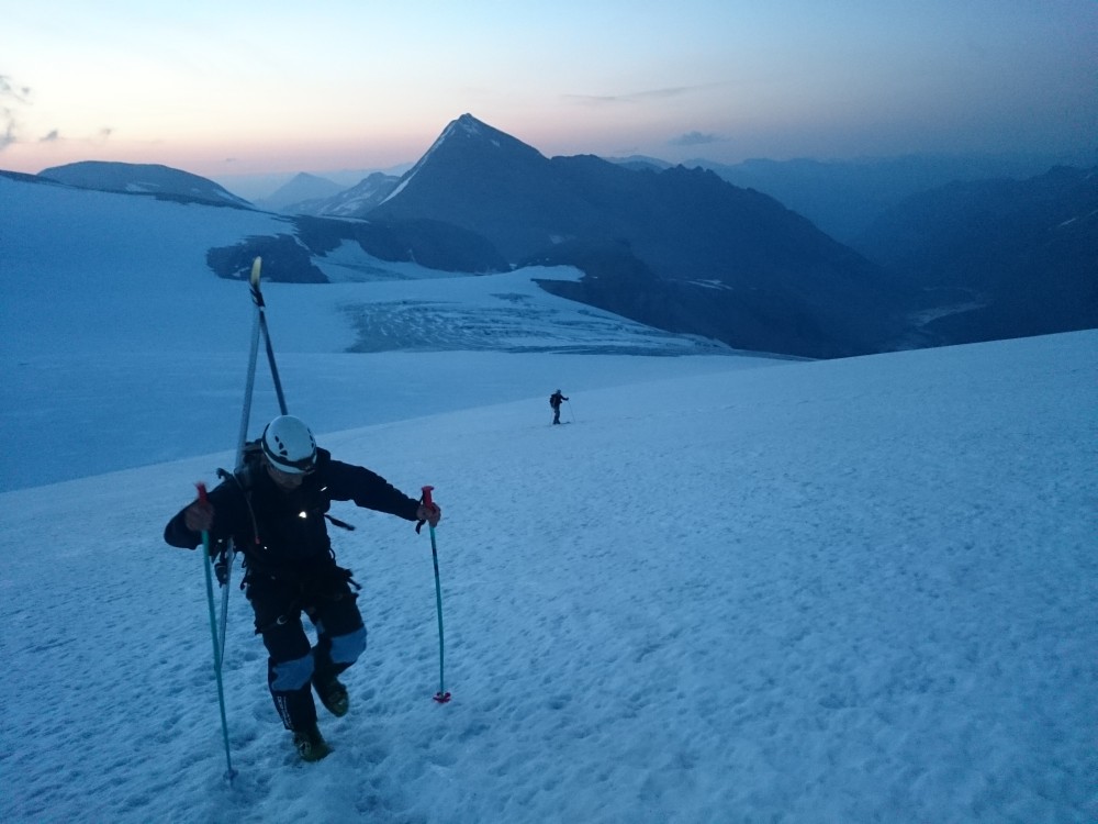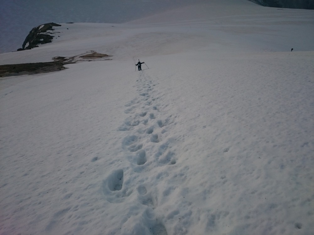 Tako smo v nedeljo že nekaj čez ena zjutraj štartali iz graž. Skozi tonele in naprej do prvega snega nekje na 2650m. Malo višje smo se držali malo bolj levo, tako da smo našli zasnežen prehod pod kočo na ledenik. Prečno smo odsmučali do pod ledenik, tako da smo pridobili nekaj časa, saj nismo šli mimo koče. Nadeljevali smo na ledenik in končno le našli pravo pot, ki vodi na vrh Janeza. Vmes so nekateri predhodniki hodili po res čudnih poteh vse do sarakov in pok. Po poti smo nadeljevali na vrh. Malo smo imeli nesreče, saj je bilo na vzhodu nad visokim Bärnkopfom nekaj oblakov. Nekako se je oblačnost pomikala proti nam, tako smo kar hitro odsmučali, da ne bi padli v kakšno meglo. Tokrat smo bili celo malo prezgodaj, saj je bilo, do približno 3000m, malo skorje. Če ne bi bilo oblakov bi verjetno bilo idealno, saj bi sonce naredilo svoje.