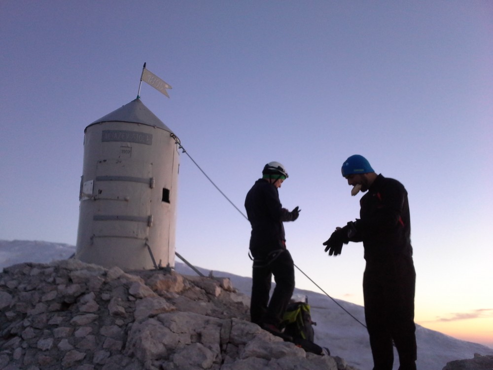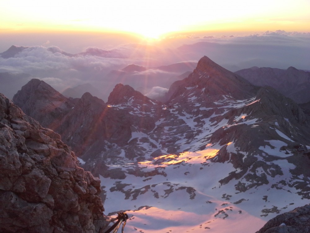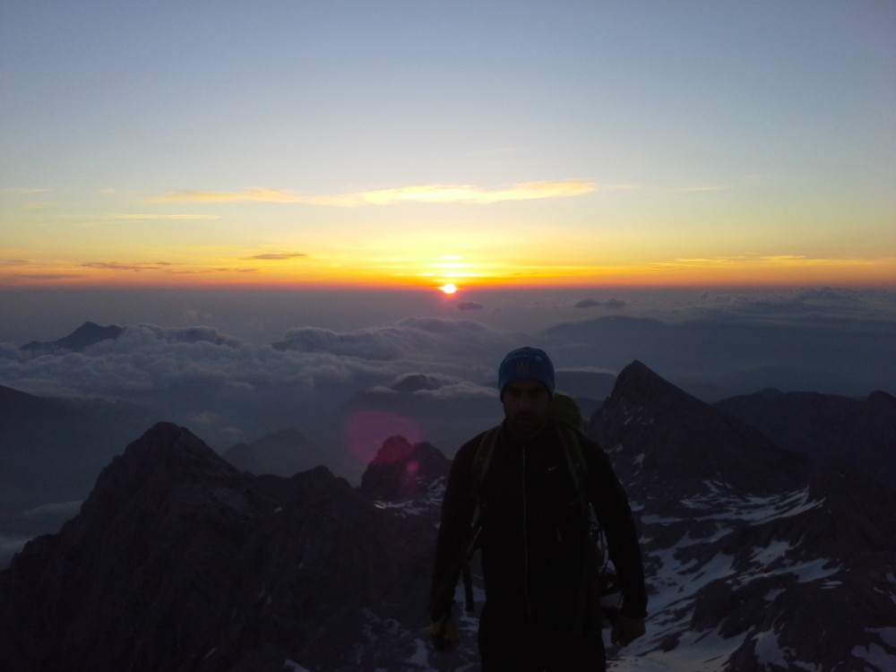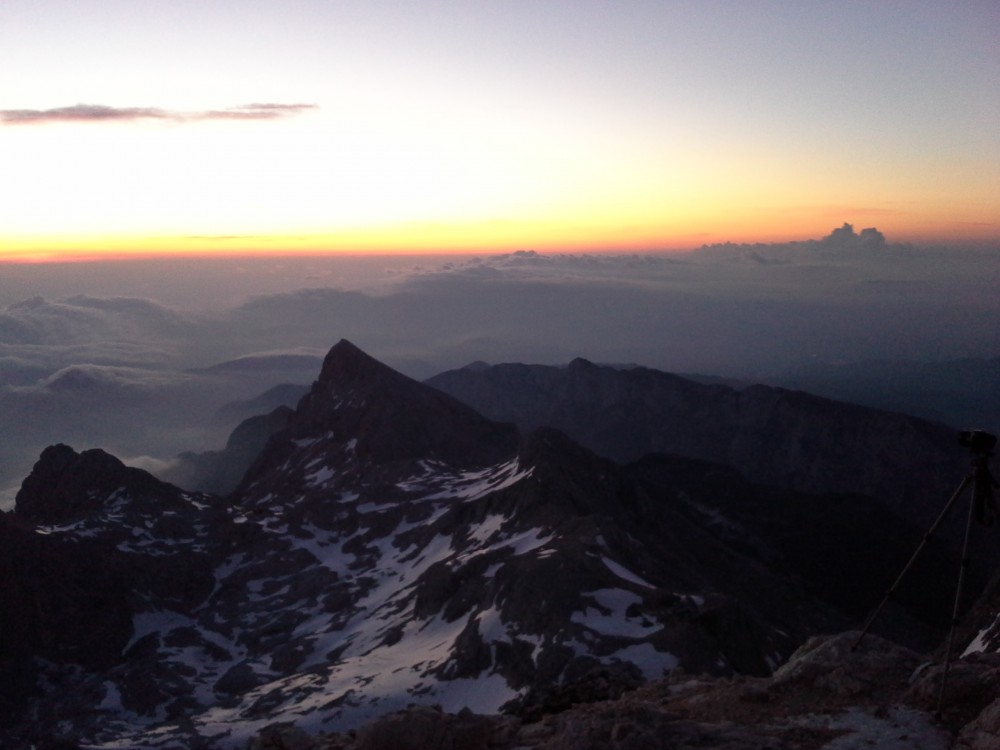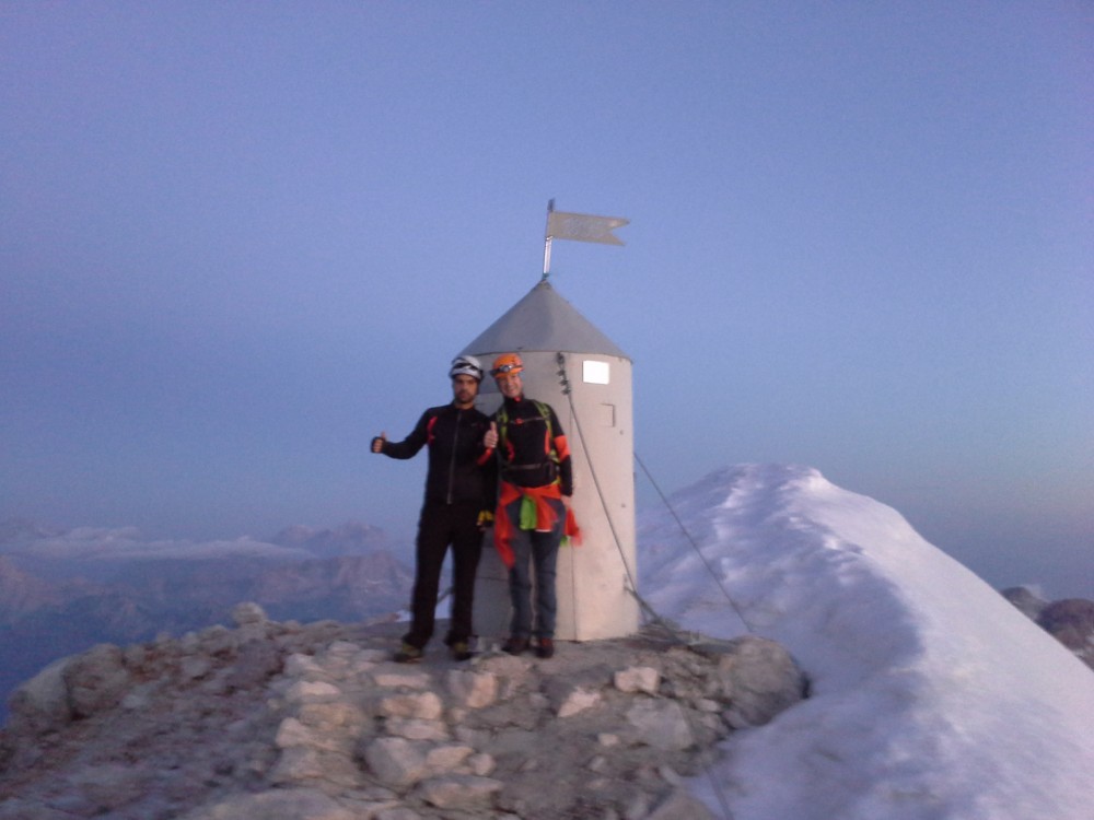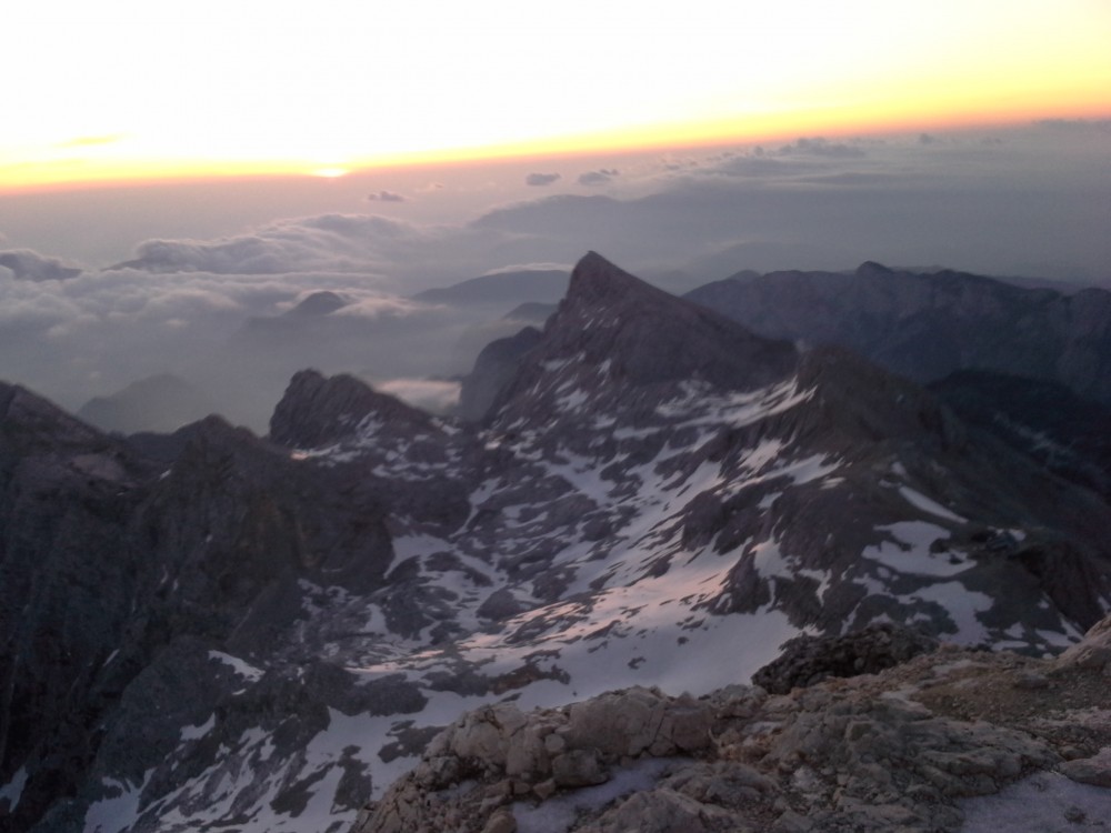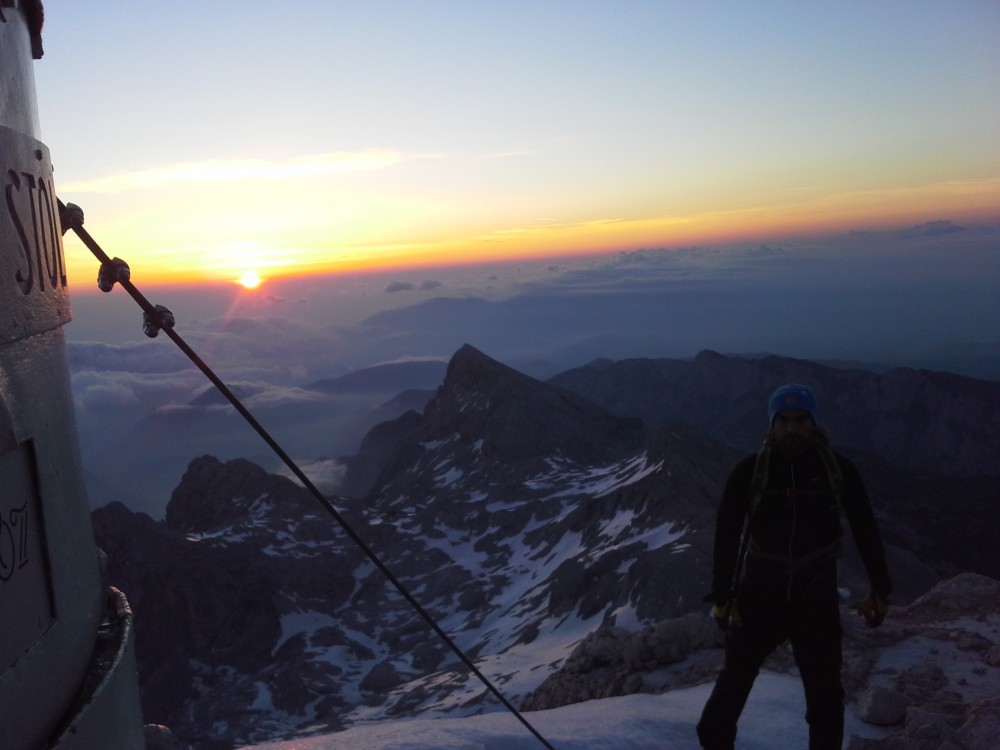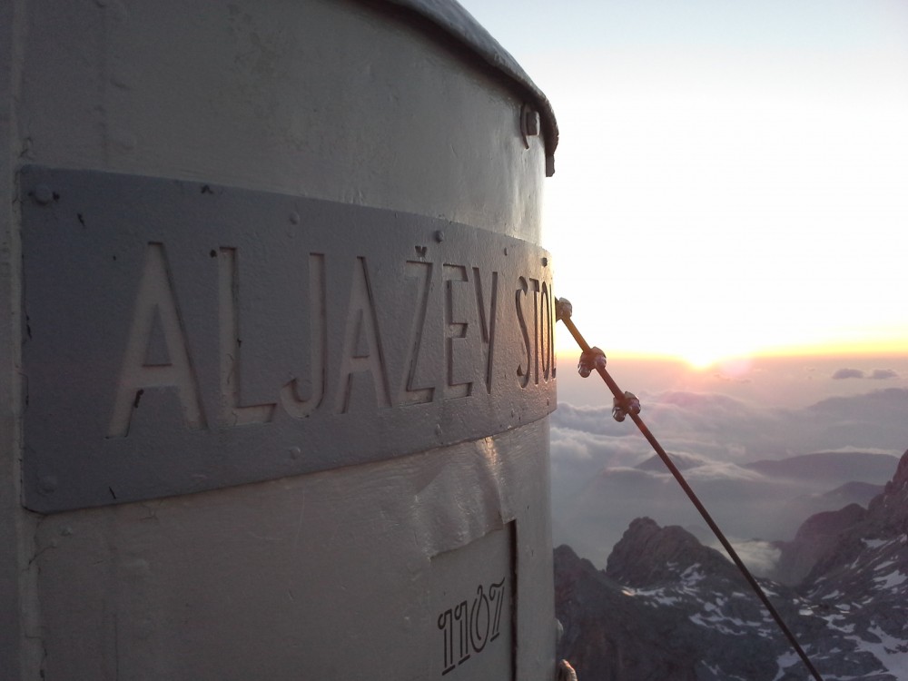 V četrtek po službi, sva se z dolgoletnim prijateljem in sodelavcem Dejanom, odpravila iz Krme proti Kredarici. Ker sva od avta krenila šele ob petih, sva stopila kar s hitrim korakom proti zgornji Krmi, kjer pa sva kmalu opazila težke oblake, ki so se nabirali nad Kalvarijo. V upanju, da se plohi nekoliko ogneva, sva stopila čez Kurico, kjer pa  je vseeno začelo neusmiljeno padati po nama. In to ne samo dež, temveč močna sodra, kar pa je bilo najhuje, pa je to, da je začelo še bliskati okoli. Tako sva v pol urnem nalivu, preživela tudi čisto bližnje srečanje z strelo, ki je udarila točno pred nama in nama povzročila konkretno tresenje kolen.  Okoli pol devetih sva premražena stopila v Triglavski dom na Kredarici, kjer sva bila deležna toplega sprejema oskrbnika Marjana s katerim smo pozno v večer kramljali in se nasmejali prigodam, ki sta nama jih servirala z vojakom Radom. Ker pa je bil namen ob sončnem vzhodu stati na najvišjem vrhu v deželi naši, pa sva potem že ob 3 uri in 15 minut vstala in po hitrem postopku mahnila proti vrhu. Kot se je izkazalom sva sonce prehitela skoraj za 20 minut in ga zaradi nizkih temperatur na vrhu, komaj pričakala. Pogled je bil čudovit, žal do morja oko ni seglo, ampak nekaj pa more ostati še za naslednjič.