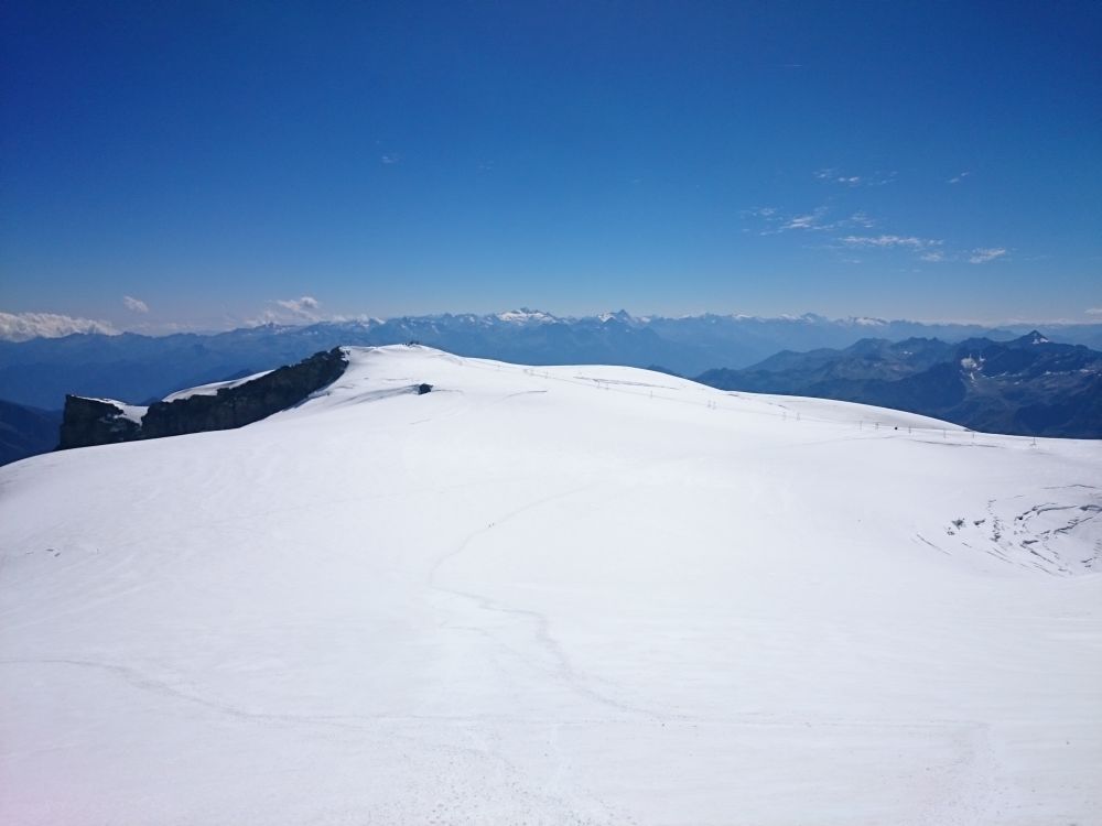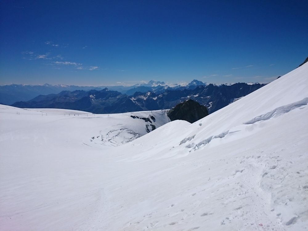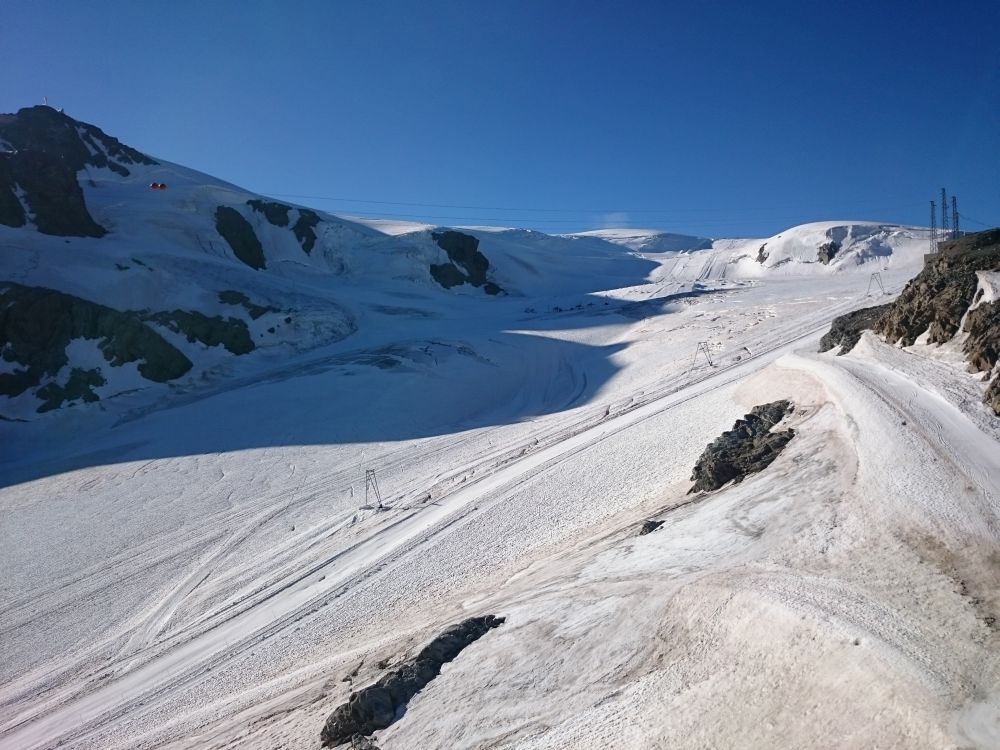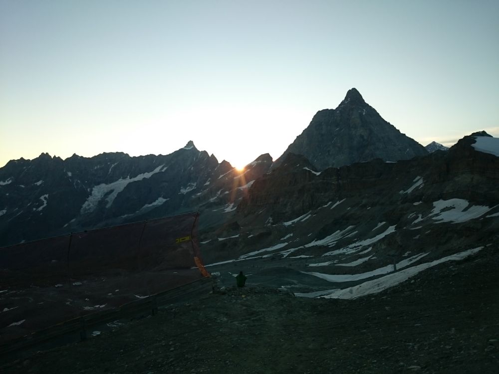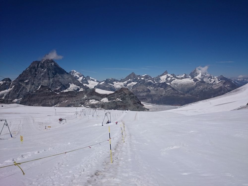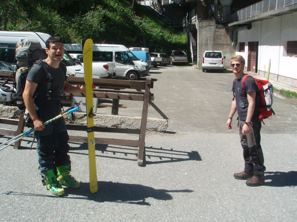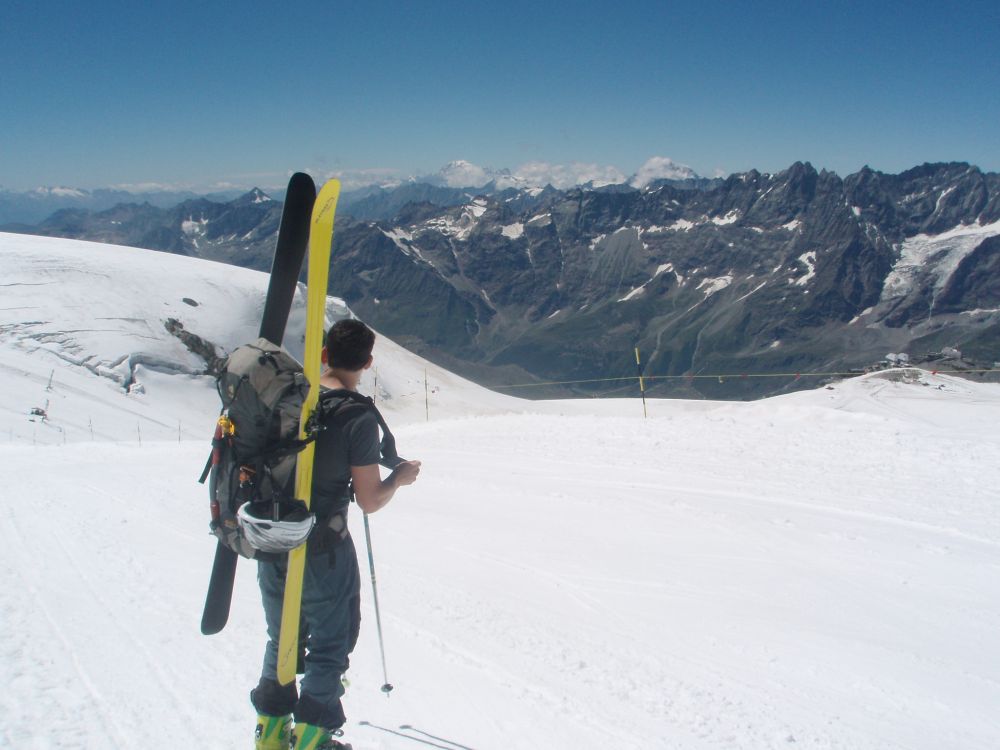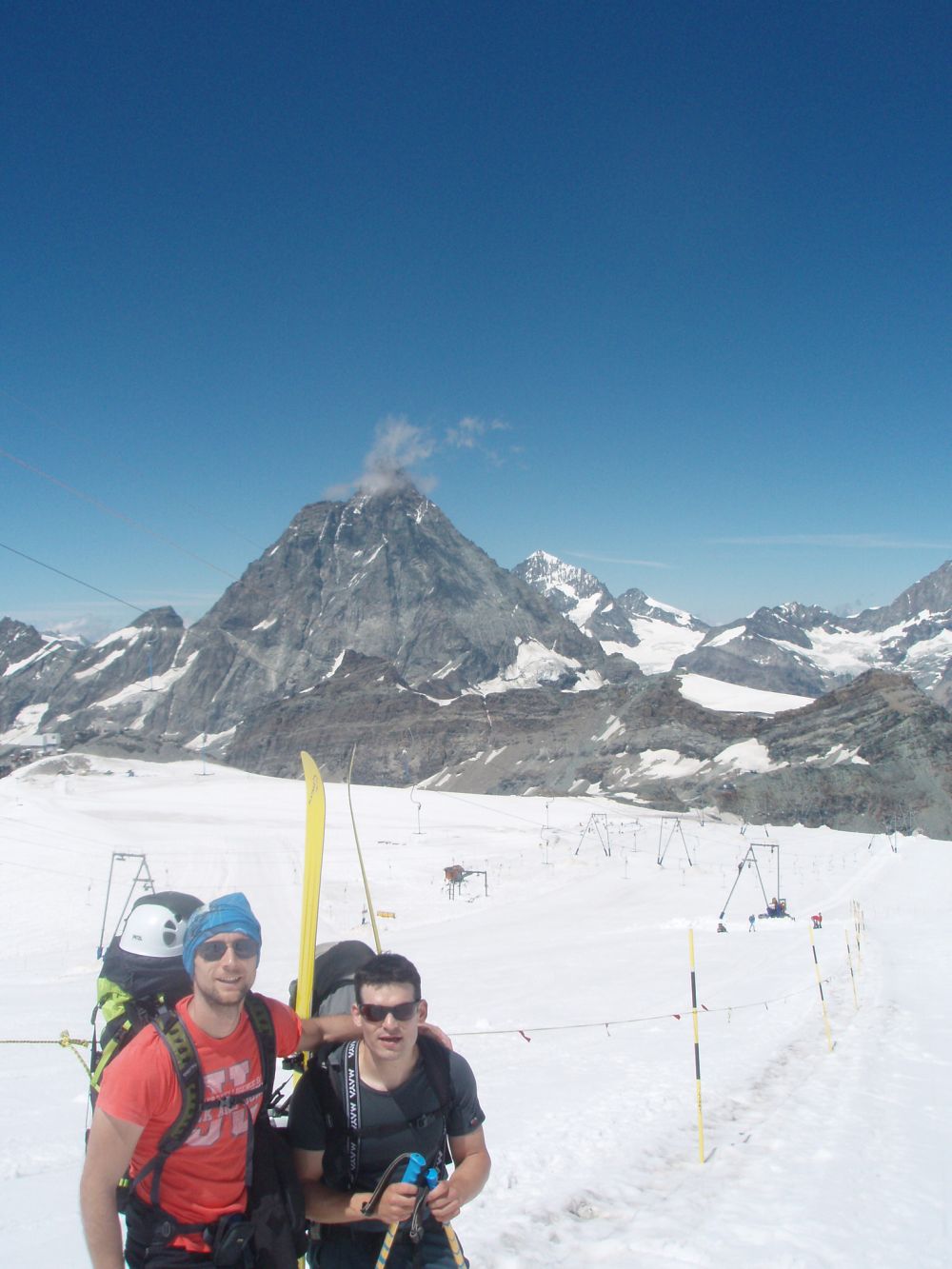 V ponedeljek 27.7. smo se ob 3h odpeljali iz Ljubljane. Vožna je trajal kakšno uro dlje kot smo pričakovali, saj smo malo pozabili na milanski zastoj, ki nastane okoli osme ure. Okoli dvanajste smo prišli v Cervinio. Bil sem edini smučar, tako da je bilo jasno, da zadnje gondole z Testa Grigie ne bomo ujeli. Namesto tega smo raje rezervirali kočo na smučišču na višini 3317m. Popoldan smo se podali proti Breithornu. Ker smo bili pozni smo srečali le nekaj sestopajočih, čaz plato in zadnjih 350 višinskih metrov, pa smo bili sami, tako da je bilo prav fajn. Vrh je bil kot ponavadi zelo vetroven in sem kar imel nekaj problemov pripeti smuči. Zgoraj je bil sneg glih prav odjenjan, tako da je bilo super. Le na platoju je ostal trd, tako da je malo treslo po nogah. Po smučišču je smuka seveda bila dobra. V koči je bilo prav luštno, vendar nas je hitro dobil spanec, tako da smo se pospravili v posteljo. Prijatelja sta malo potegnila spanje, jaz pa sem še enkrat krenil na Breithorn, saj je vreme bilo dobro, smuka pa tudi. Tokrat sem šel čez sedlo med obema vrhovoma. Veter pa je bil še hujši kot prejšnji dan. Odsmučal sem vse do koče in se skupaj s kolegoma podal nazaj do gondole. Sredi dneva smo bili že nazaj pri avtu. Po kosilu smo se odpeljali proti Alagni.