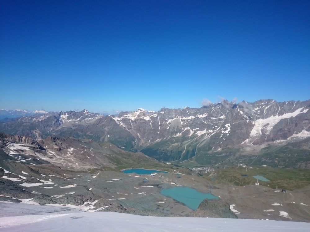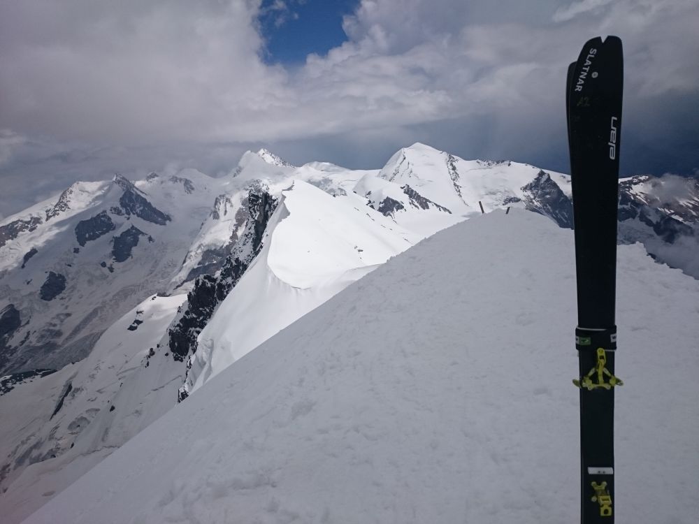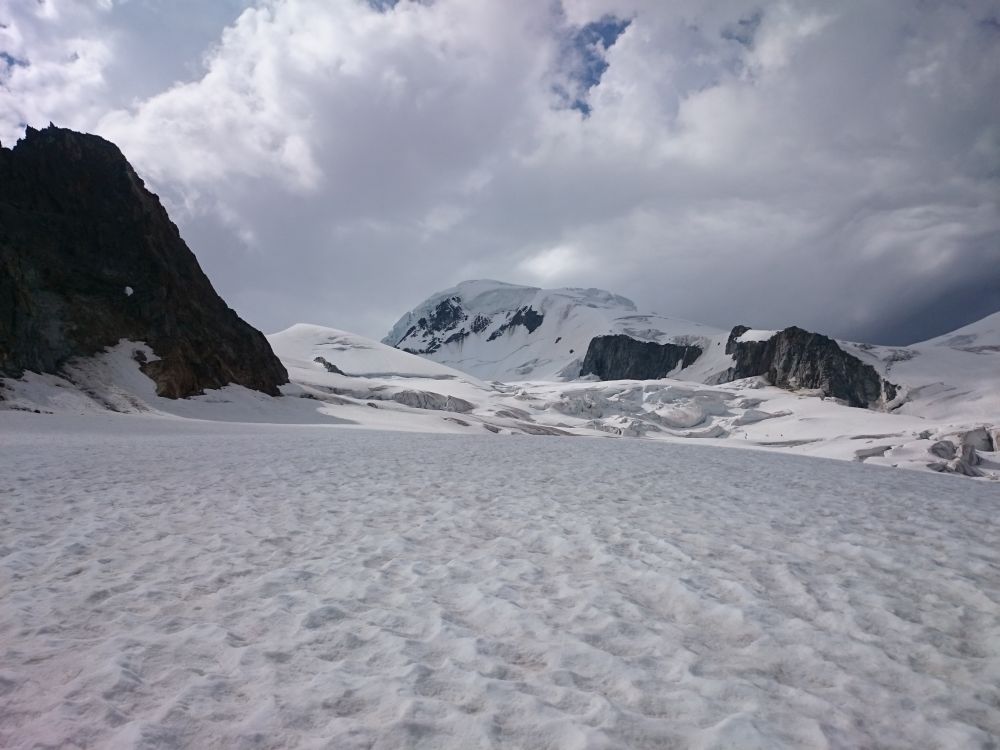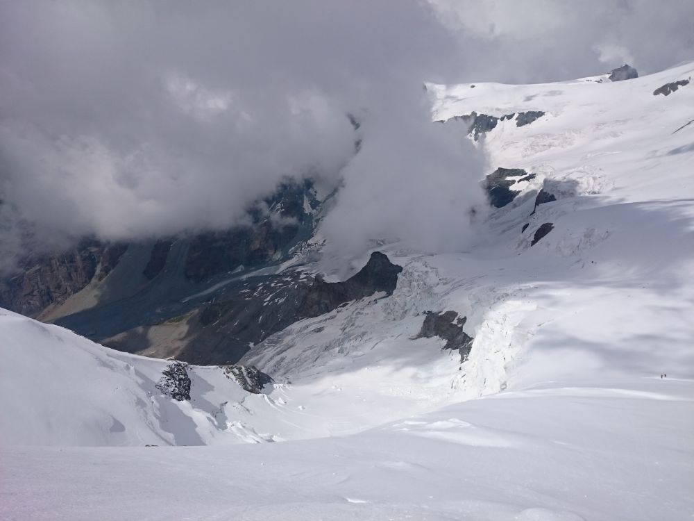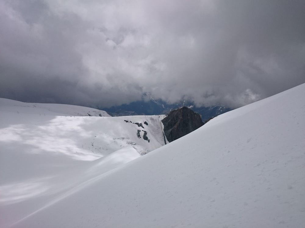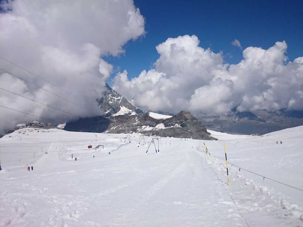 Prejšnji torek smo se zgodaj zjutraj odpeljali iz Ljubljane, tako da smo se izognili Milanski jutranji gužvi in že okoli 10h pripeljali v Cervinio. S pomočjo gondole smo bili hitro na Testa Grigi. Najprej sem odsmučal do koče Teodulo, nato pa nazaj peš proti Breithornu. Pri gonodoli sta me čakala prijatelja in skupaj smo se podali na pot. Snega je v teh krajih več kot lani, tako da se tudi pri Matterhorn platoju nismo navezali. Približno 200 višinskih metrov pod vrhom nam je malo zagodil vreme, saj je v daljavi že nekaj garmelo in proti Monte Rosi so bili kar temini oblaki. Prijatelja sta se raje obrnila, saj sta bila peš in v nevihti ne bi bilo fino. Na vrhu sem bil sam in prvič tudi v brezveterju, tako da je bilo kar prijetno. Vreme se je malo izboljšalo, tako da je bila vidljivost dobra. Nekaj zavojev je bilo še bolj po tršem snegu, nato pa je bil sneg že južen, ki pa je bil zelo lepo smučljiv. S platoja sem kar hitro odsmučal s proge desno na pobočje Klein Matterhorna in v super snegu odsmučal do spodnjega dela smučišča. Prečil sem in se zapeljal do koče.