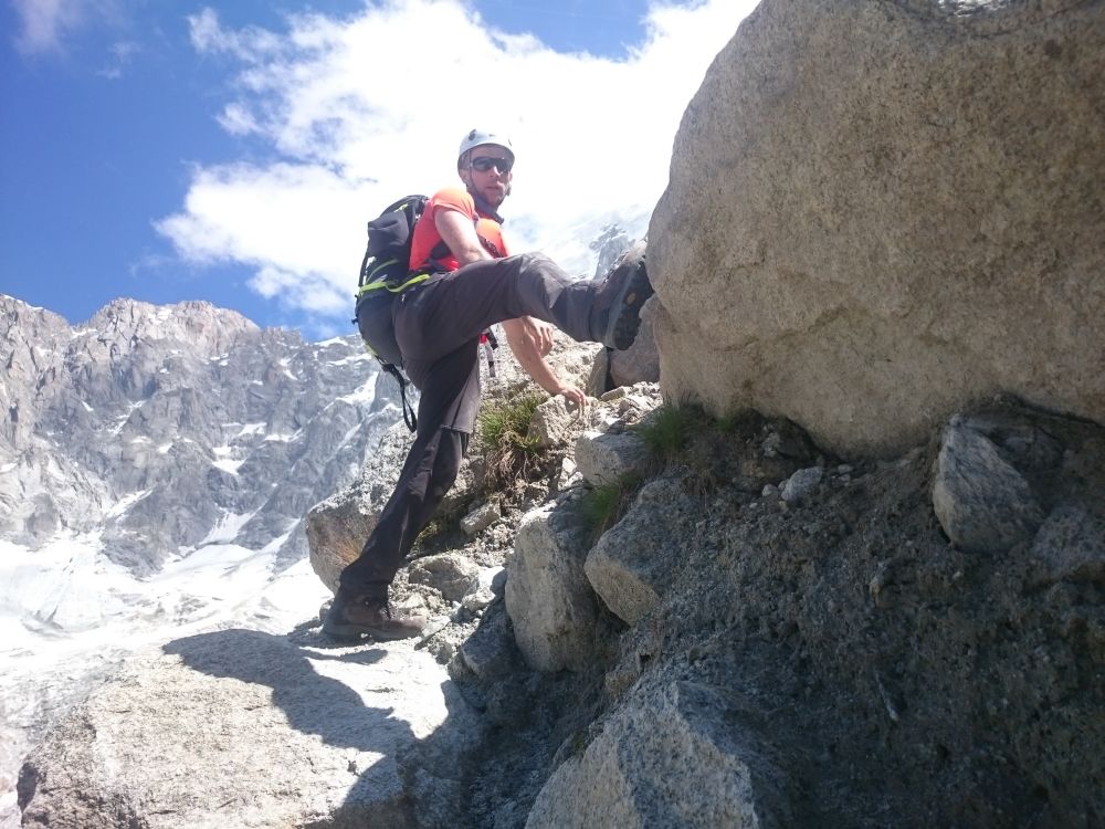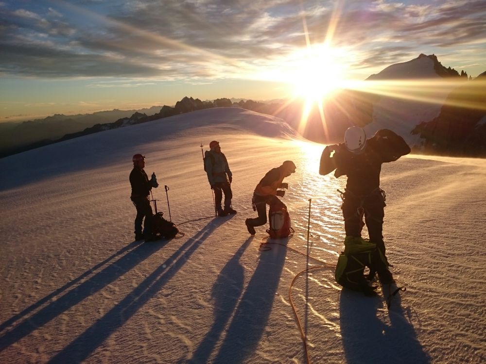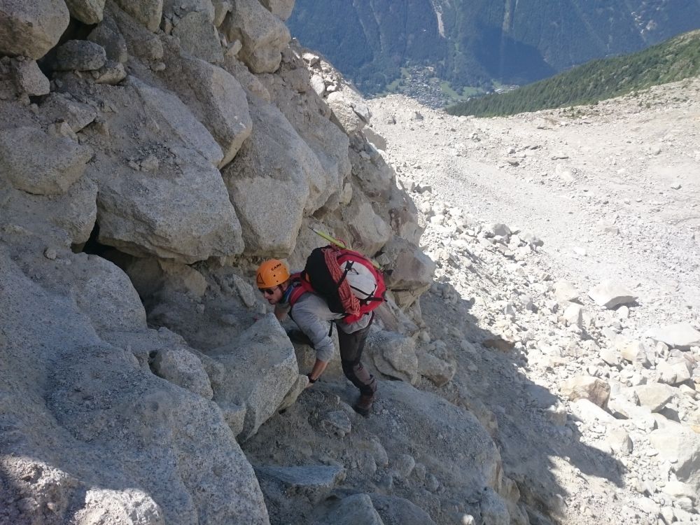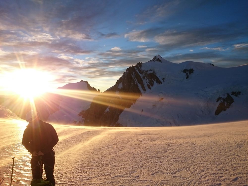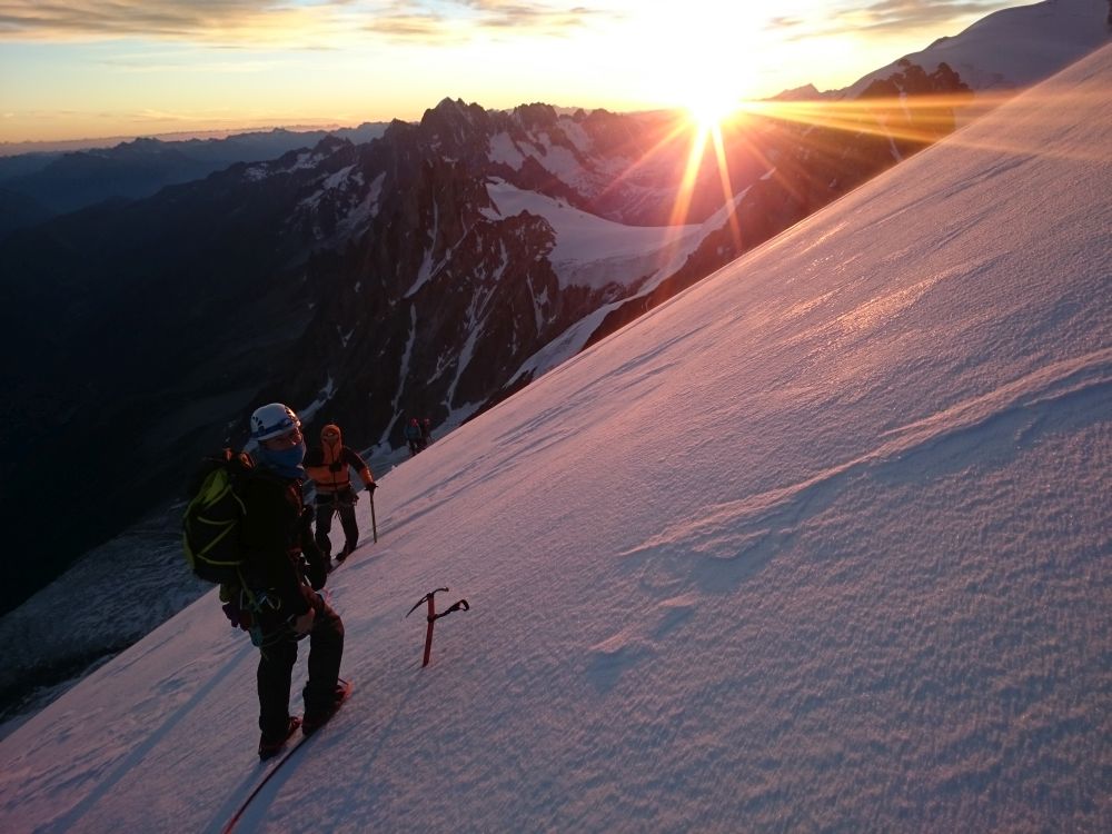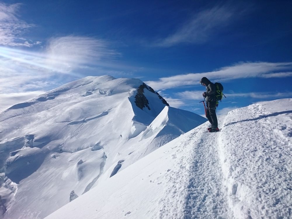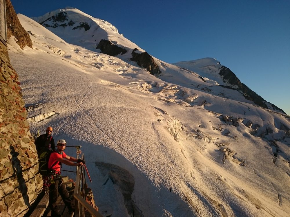 V Chamonixu smo prespali v kampu. Nasledni dan pa smo se z gondolo odpeljali na Pian de l’Aiguille. S kar težkimi ruzaki smo začeli našo pot proti ledeniku Bossons. V zadnjih letih se je pot kar nekoliko spremenila, tako da je vmes kar siten sestop in nazaj vzpon. Pravzaprav je potrebno plezati dol in potem nazaj gor po pesku. Pri ledeniku Bossons smo se navezali in prečili v desno. Skupaj še z dvema nemcema smo le našli pot čez razbite sarake in poke. Na približno 2600 m smo prišli na lažji svet, ker smo tudi videli kočo Grands Mulets (3057m). Ker smo popoldan štartali iz Chama smo do koče prišli šele zvečer. Po nekaj urah spanja smo s hojo začeli okoli 3h. Izbrali smo bolj varno pot čez greben, mimo Pointe Bravais in Pointe Bayeux, do Dome du Gouter. Nekako se je že počasi slabšalo vreme. Nad Dome du Gouter je bil kar mrzlo in veter se je krepil, tako da je bil sneg povsem trd srenc. Pri bivaku sem se odločil, da bom smuči pustil tu, saj je bilo zelo trdo, jaz pa nisem bil povsem spočit. Poleg tega bi moral najti vse prehode na severnem pobočju Mont Blanca. Kasneje se je še žal naredila megla in vidljivost je bila nad cca 4400m največ 20 m. Okoli 10:30 smo prišli na vrh. Kar hitro smo se poslovili, jaz sem šel po isti poti, sotrpina pa sta jo ocvrla proti Aiguille de Midi. Pri bivaku sem nekoliko počakal, tako da ni bilo difuzne svetlobe in odsmučal proti Gouter. Obrnil sem desno proti velikem platoju in nato levo po klasični turno smučarski trasi desno od velikega in malega Montees ter čez mali plato. Smučal sem vse do koče, kjer sem le pobral nekaj robe in naprej vse do približno 2600m, kjer se začne prečka čez razbiti ledenik za nazaj proti gondoli ali v Chamonix. Zgornjih dobrih 1000 višnskih metrov je bil taparvi zimski srenc, vmes do koče pa glih prav južen sneg. Nekaj metrov pod kočo so pa se začele jamice in star sneg, tako da je bila smuka nekoliko težja. Tokrat sem bil hitro čez ledenik in pri gondoli, kljub temu me je ujel dež, tako da sem na gondolo stopil premočen, vendar vesel nad dolgo in odlično smučarijo, ki je bila ena najlepših v letošnji sezoni. Tako smuko je še pozno pozimi težko najti.