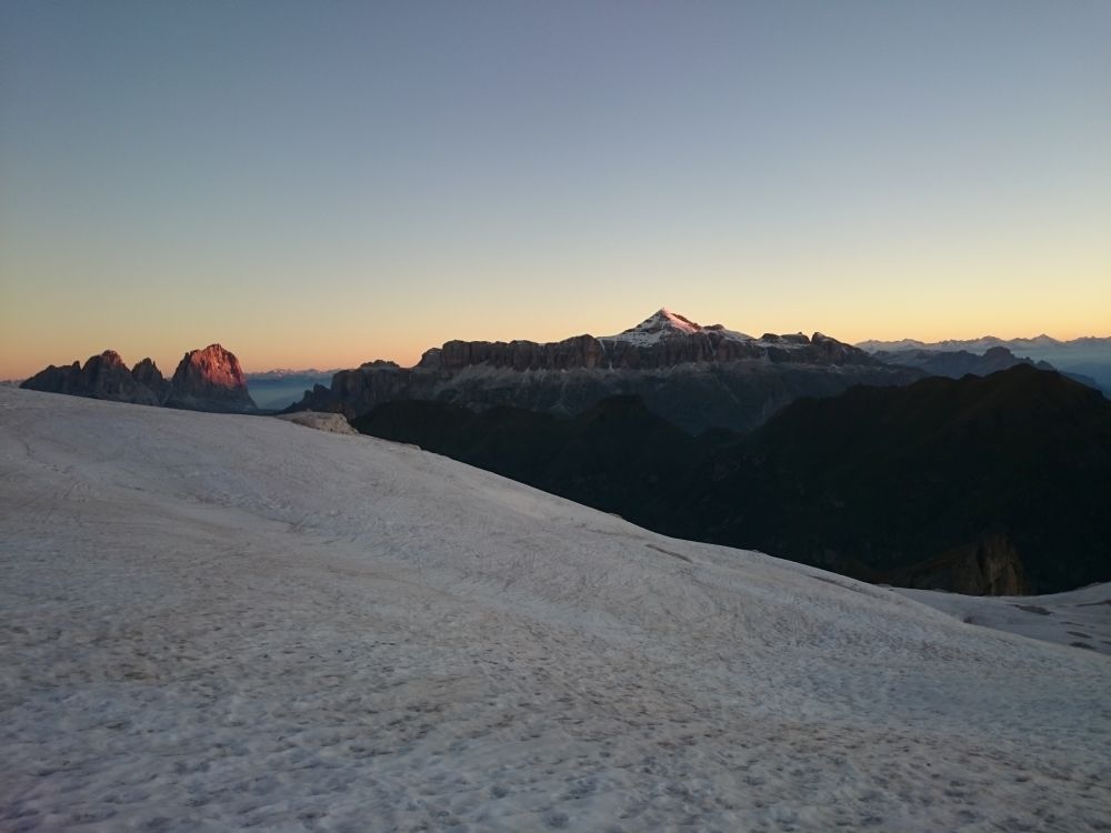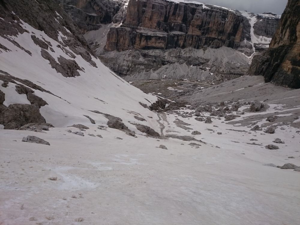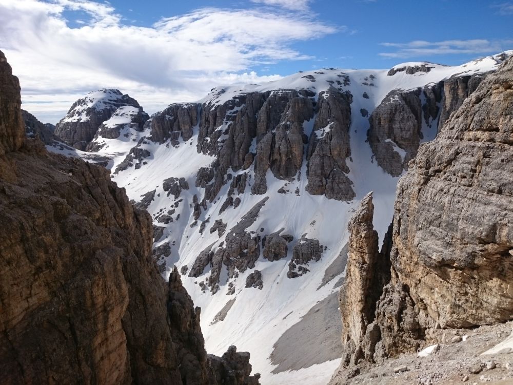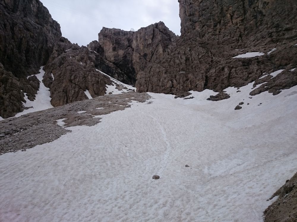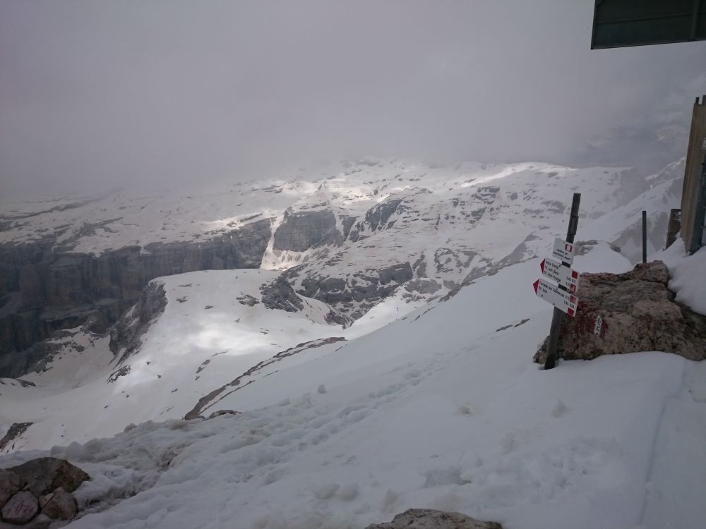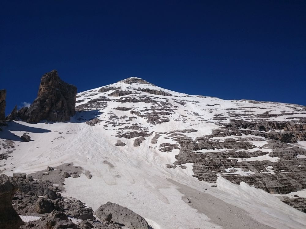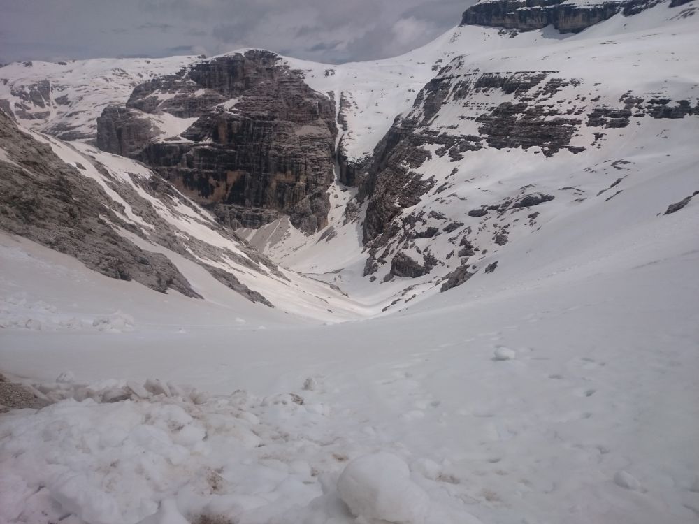 Vremenska napoved je napovedovala lep in topel prejšnji teden, tako smo pred 30+ stopinjami pobegnili v višje kraje in za uvod v koledarsko poletje izbrali italjanske Dolomite. Letos je tudi tam še kar veliko snega in izbrali smo take ture, ki še omogočajo turno smuko. Dva turna smučarja, en pešec in vsa roba pa je bil avto poln.