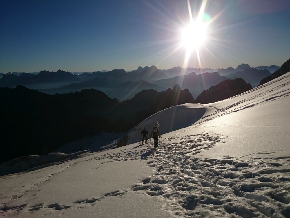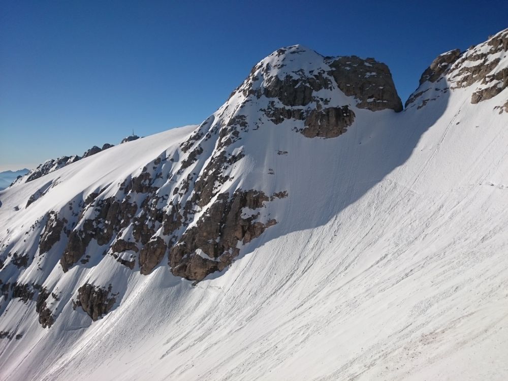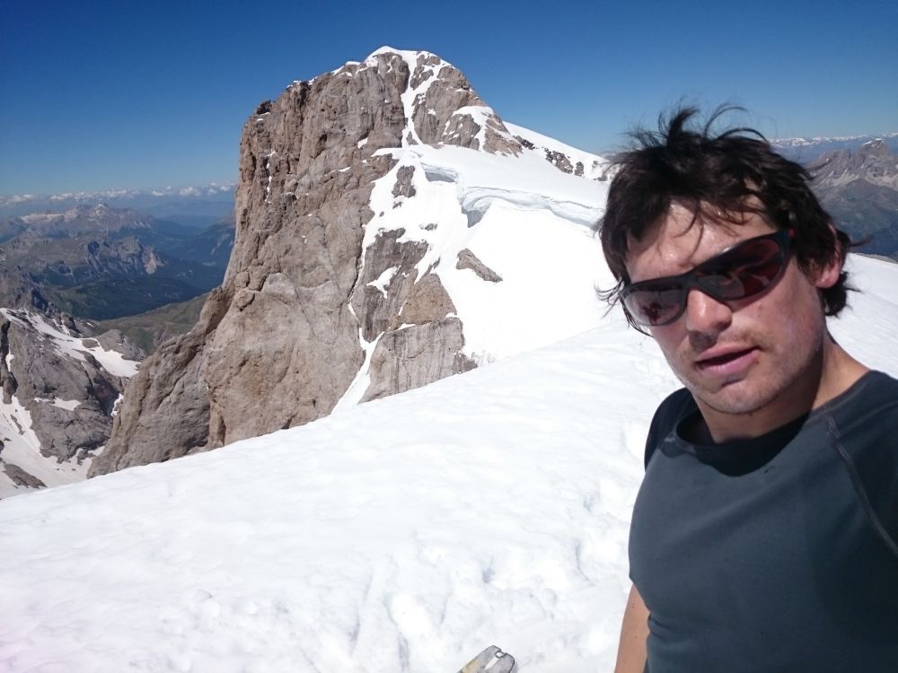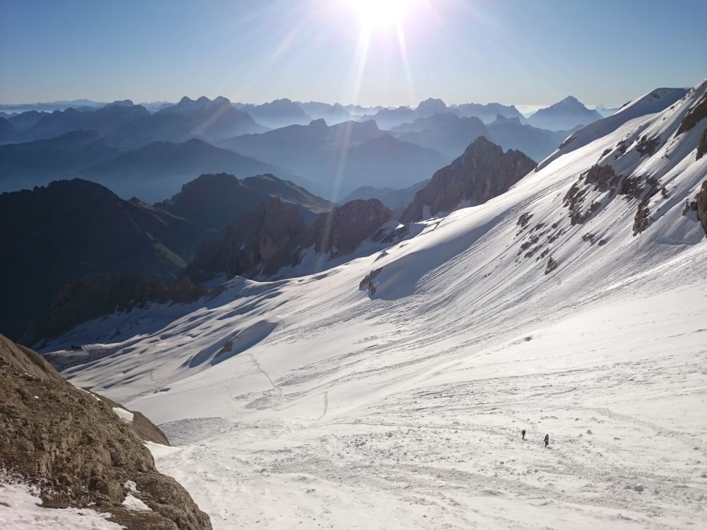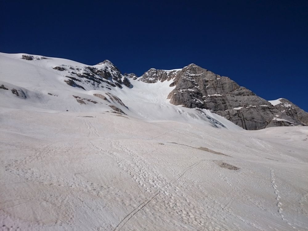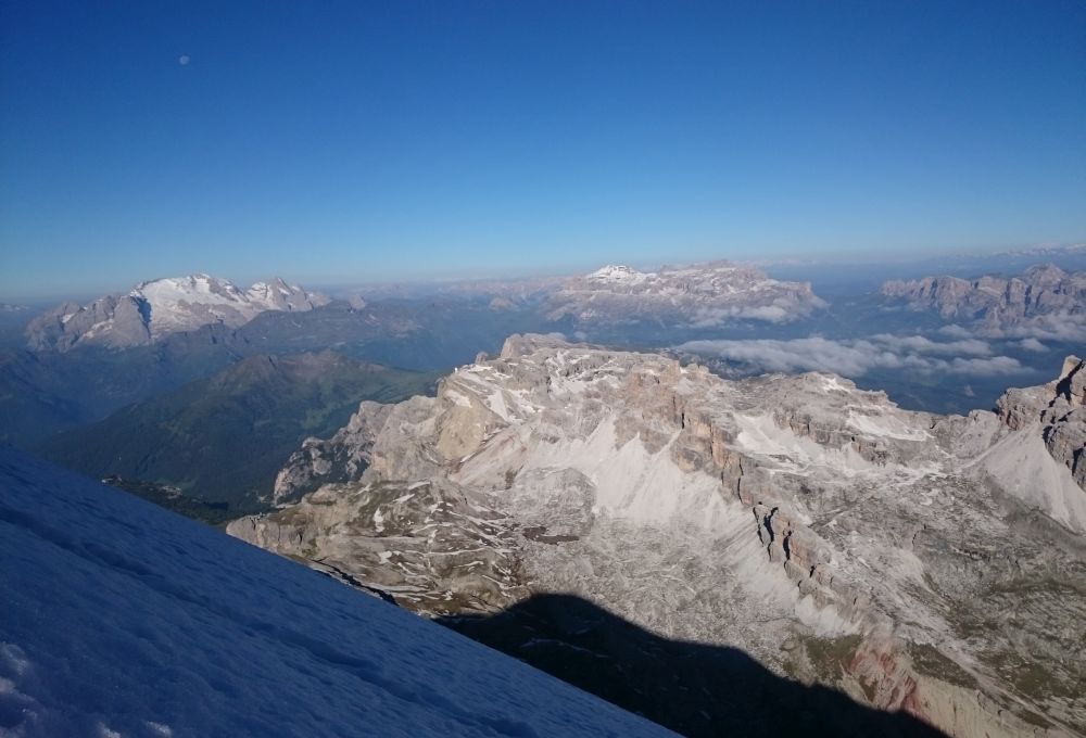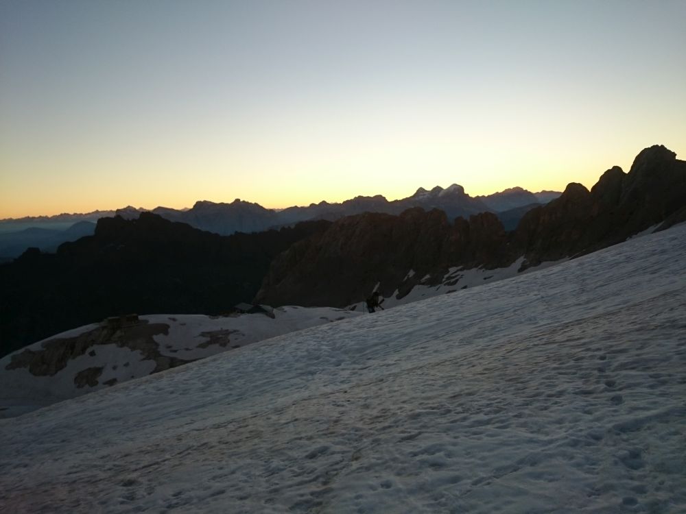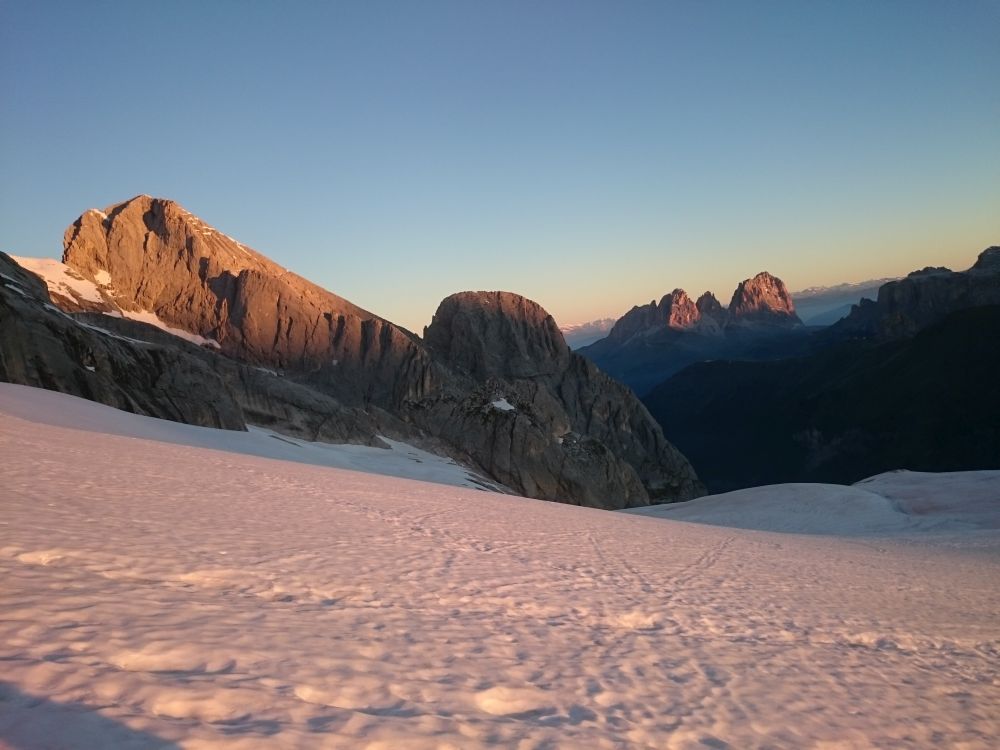 Že v torek smo, po pregledu vremenskih napovedi, nekako za četrtek imeli v planu Marmolado. Tako smo se v četrtek že zgodaj odpravili proti Marmoladi. Stoječa žičnica Fiacconi začne delati šele ob 8:30, tako da smo začeli s hojo kar od parkirišča na Passo Fedaia (cena enosmerne karte je 6€ in povratne 10€). Tu pod žičnici, se je sneg začel na približno 2500m. Naprej je bilo vse zasnežno in nad približno 2800m se je začel novi sneg. Zaradi jasne noči in zgodnje ure je bil sneg pomrznjen, tako da nam je bilo gaženje prizaneseno. Povzpeli smo se po običajni poti čez ledenik in po zajli na greben. Vse ledeniške razpoke so bile povsem zaprte in že pred 8h smo bili na vrhu. Za ta čas odlične razmere. Kolega je, že po južnem snegu, sestopil midva pa sva odsmučala po grebenu in se še pred zajlo obrnila iz grebena v grapo in nato še v eno grapo, ki sta še bili zasneženi, tako da nama ni bilo potrebno sestopati. Nižje smo se malo razdelili. Sam sem odsmučal kar globoko pod kočo, si nadel kože ter se podal še na Punta Roca. Po odličnem južnem celem snegu, ki je bil kot puterček, sem odsmučal direktno proti koči oz. žičnici Fiacconi. Kasneje sem smučal mimo koče in se držal desno ob skali Sas da les Doudesc. Tu sem se ujel še z sotrpinom in skupaj sva, še brez snemanja smuči, odsmučala do konca jezika pod 2400m. Pridružil še je še tretji član ekipe in skupaj smo sestopili do avta. Nabralo se je kar 1700 višnskih metrov smučanja.