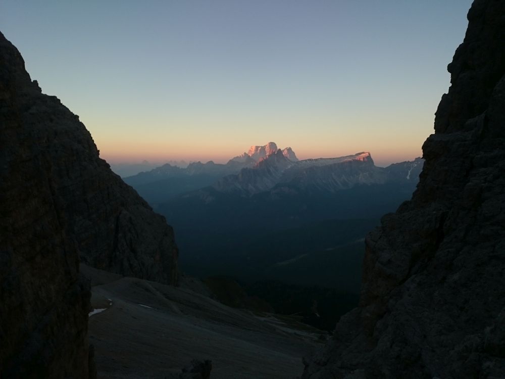 Dolomitski opus sva zaključila nad Cortino, s smučanjem iz Tofane de Rozes. Tudi v petek sva štartala zgodaj. Parkirala sva pri koči gorskega vodnika Angela Dibona, si nadela težke nahrbtnike in v lahkih čevljih prisopihala do koče Camilio Giussani. Tam je, na srečo, bilo že toliko svetlo, da sem lahko naredil sliko, ki nama je bila, pri vzponu in delno tudi pri spustu, v pomoč pri iskanju povezanih prehodov. Kar kmalu je stari sneg zamenjal novi, ki je že bil v južnem agregatnem stanu in hočeš nočeš morala sva gaziti. Vseeno nama je, ob opazovanju terena, pobočja in snežnih razmer, čas hitro minil, saj sva pričakovala vrhunsko smuko. Kar visoko nad 3100 m sva prišla do SZ grebena, prešla sva na zahodno pobočje in ob grebenu, kjer poteka običajna pot, prišla na vrh.