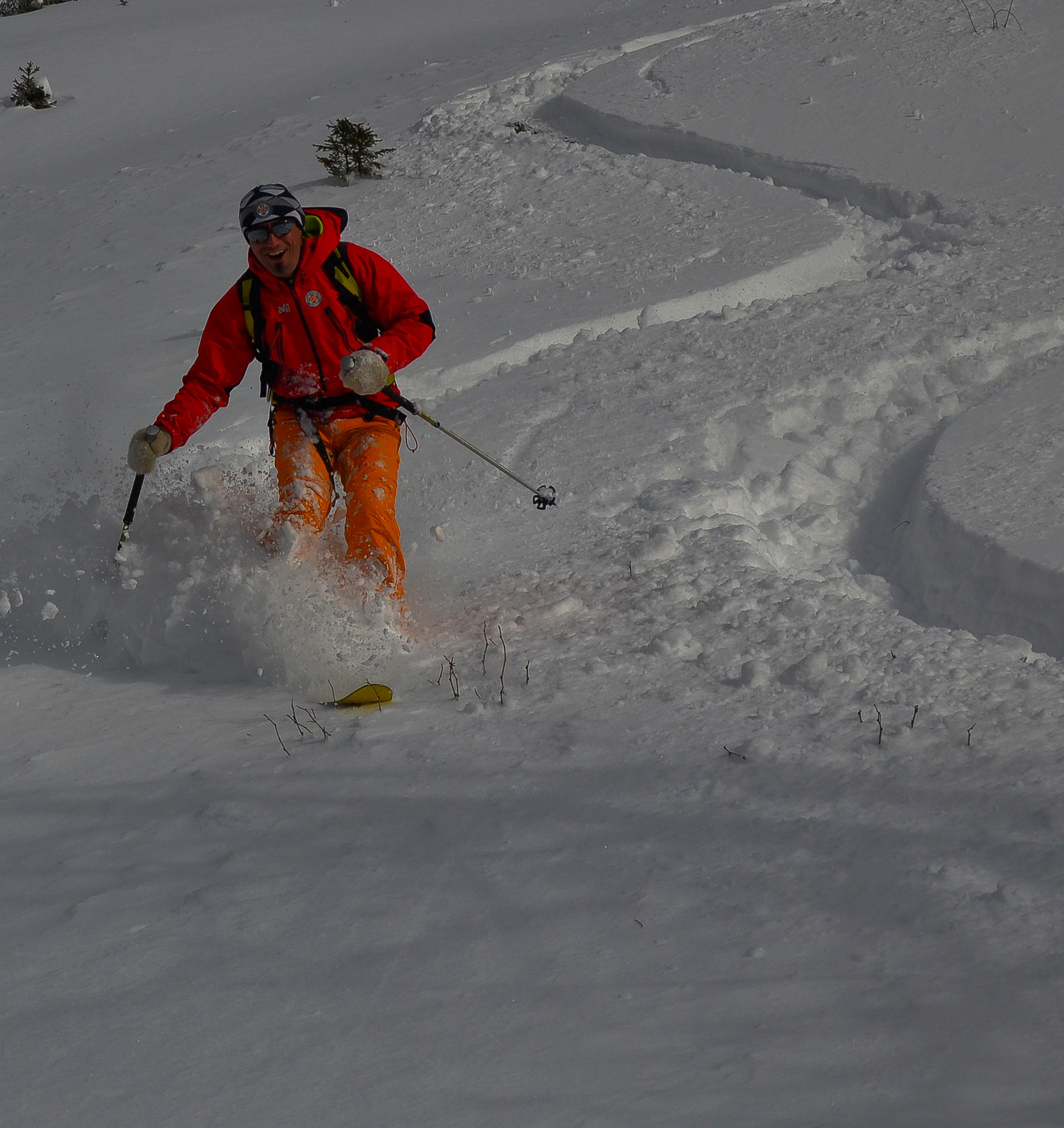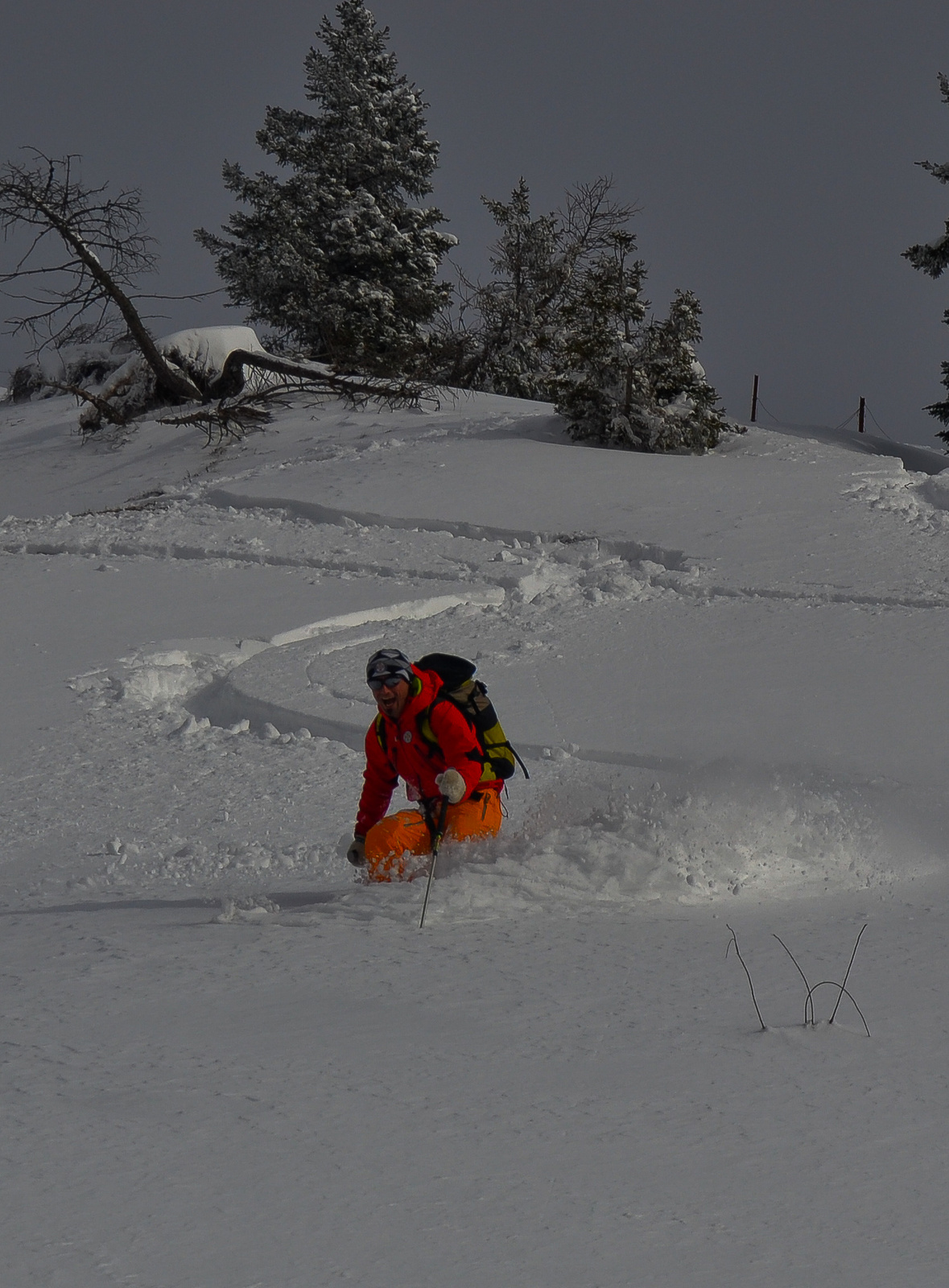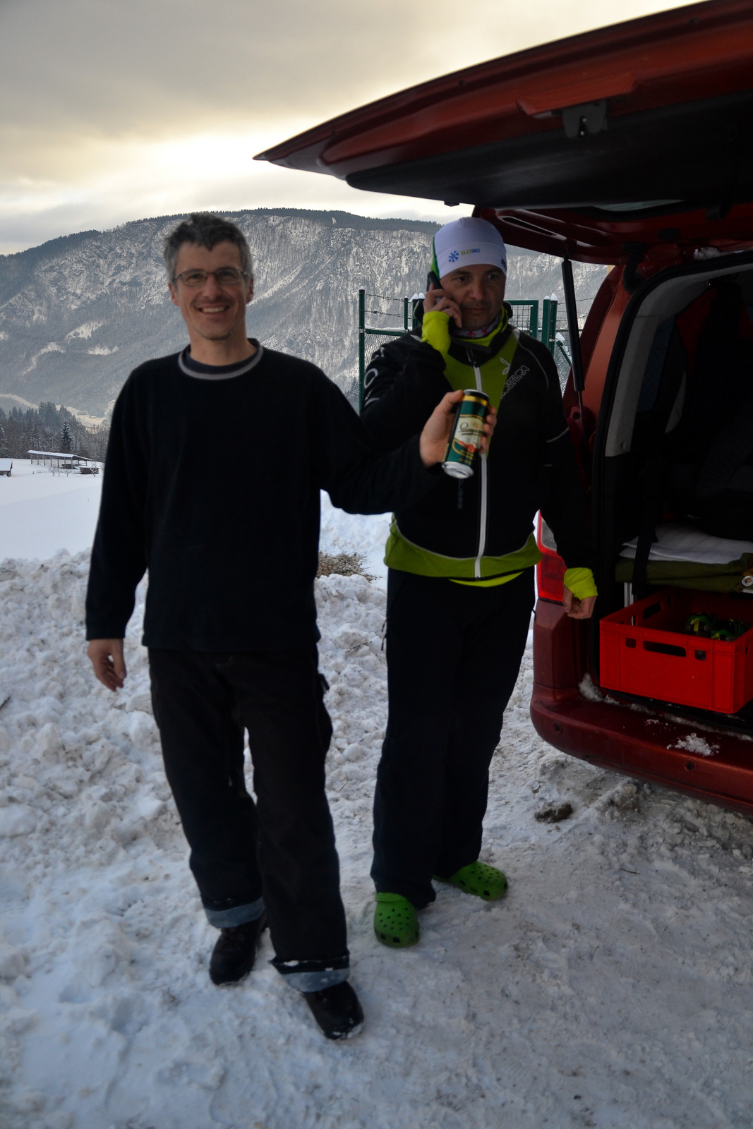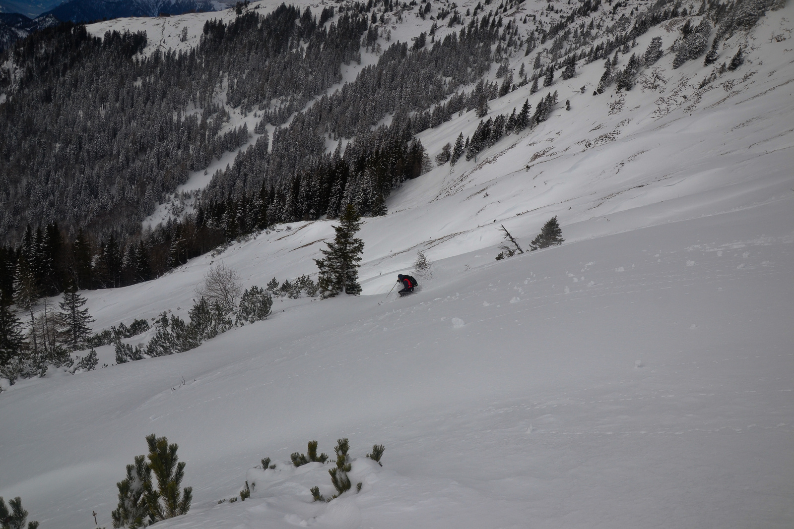 Končno spet z Žigom skupaj. Nekako nama rata uskladiti potrebe po pršiču, analitično za nosom, pa veter sneg itd.Tokrat šla na domač kucl nad najlepšim mestom na svetu. Gazila k nora, vendar bila poplačana s norim smučanjem. Severovzhodni veter je včeraj moral odlagati sneg nekam. Le poiskati ga je bilo treba. Itak kasneje ni manjkal Miro Podgoršek, ki je svoje taktiziranje s gaženjem plačal s Staropramen pri avtu. Vmes pa še gsm od Petra, ki si ni mogel upreti mamljivi skušnjavi. Uživali Jure, Žiga, Miro, Peter