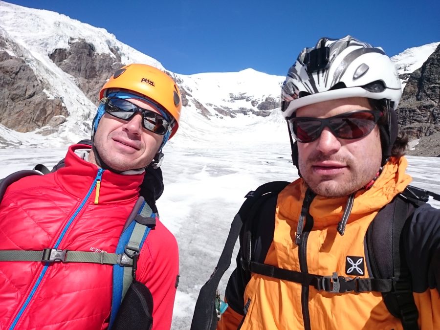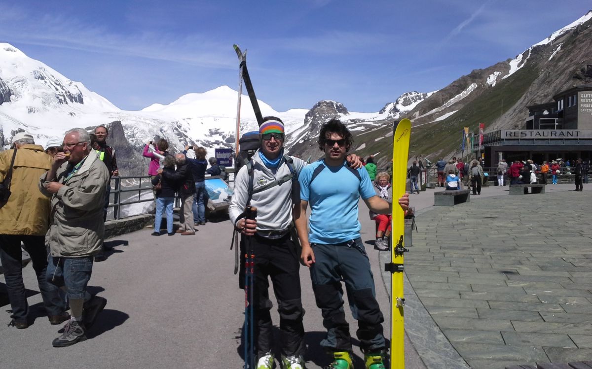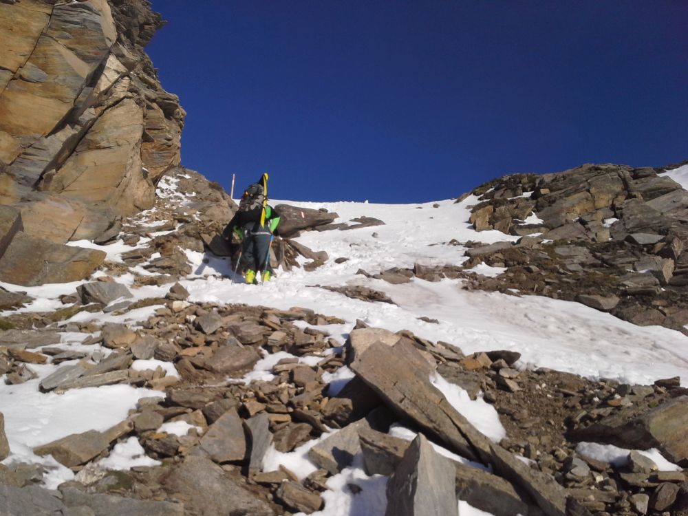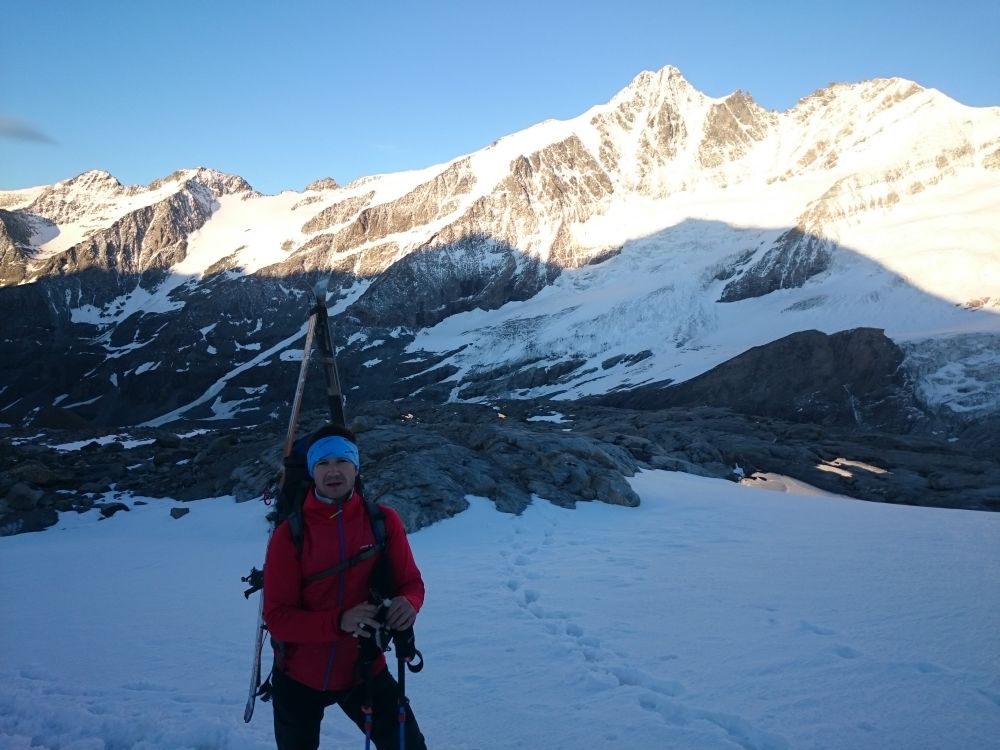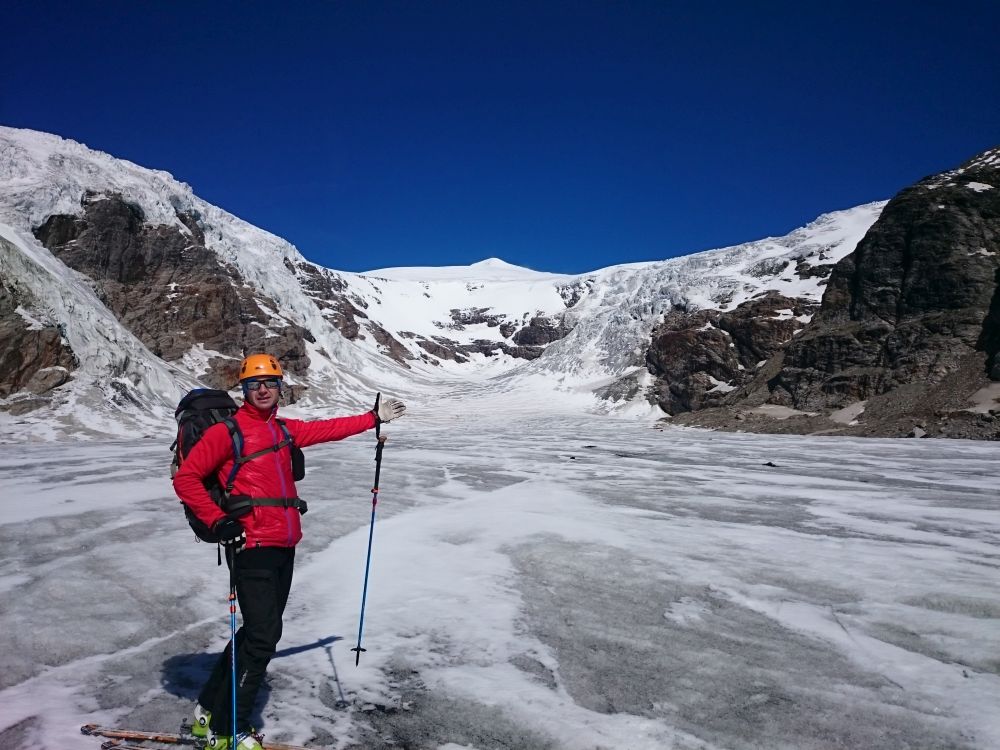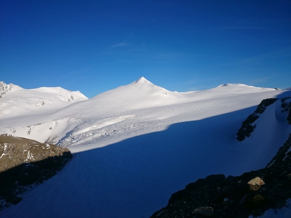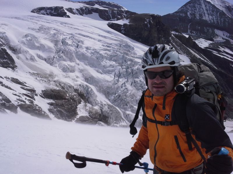 No in končno je prišel na vrsto spet Johannisberg vrh nad ledenikom Pastirci pod Velikim Klekom, če se izrazim izvorno. Tam sem bil prvič pred petimi leti, ko naju je z Samotom s seboj popeljal legendarni Rok Medja. Tokrat sva se odpeljala sama ni pa baje veliko manjkalo, da bi ga spet osvojili skupaj. Odrinila sva že dan poprej in seveda prespala oz. predremala v garažah na platoju. Se ve zakaj… tudi hitrost priprave na turo zjutraj je tako hitrejša, spočit pa ne greš na kar dolgo in položno pot. Ampak končna ocena današnje ture pa vse to odtehta, nasploh odločitev, da smučava direktno z vrha na ledenik je bila najboljša. Krenila sva ob pol petih z platoja in po urci hoje stopila na sneg. Temperatura se je s tem drastično znižala (-10 ob močnem vetru) in malo pred Oberwalderhutte (2973nm) se je Samo že močno podhlajen odločil, da ta dan vrha ne bo mogel osvojiti samo v majici Ljubljanskega maratona in z mojo pomočjo oblekel vse kar sva imela toplega s seboj. Ogrel se je šele tik pod vrhom, ki sva ga ob pol devetih že veselo občudovala in razglede okoli. Zgodnja ura in zares nizke temperature za ta letni čas pa še nekaj na novo zapadlega zbitega snega, sta namreč zagotavljala zares uživaško smučarijo. Tako sva kar hitro skočila na smuči, odsmučala na ravno prav mehki podlagi, direktno iz vrha proti vhodu na ledenik. Zaradi samega hitenja in brez ogrevanja, je meni kmalu postalo jasno, da se bom zopet boril z krči na stegenjskih mišicah. Temu je botroval tudi orenk trening CF-ja v torek, ko nas je Domen pošteno vzel v roke. Ampak po vstopu v strm del koluarja na vrhu Pastercov, časa za razmišljanje ni bilo več in tako so tudi krči postopoma izginili. Teren je bil mestoma poledenel, na sredini pa odličen in oprijemljiv in do ledeniške morene in ledu je bila smučarija perfektna. Pripeljala sva se še čisto do konca ledenika in moja prva misel je seveda bila, da sva pa že skoraj pri avtu. Na mojo žalost sem ugotovil, da je vzpon do garaž še kar dolg in naporen, vendar sva se lepo zamotila ob opazovanju označb o višini ledenika v preteklih letih. Res se hitro topi in čez nekaj časa, mogoče res ne bo več možno tu smučati ob tem letnem času. Uživala Rok in Samo