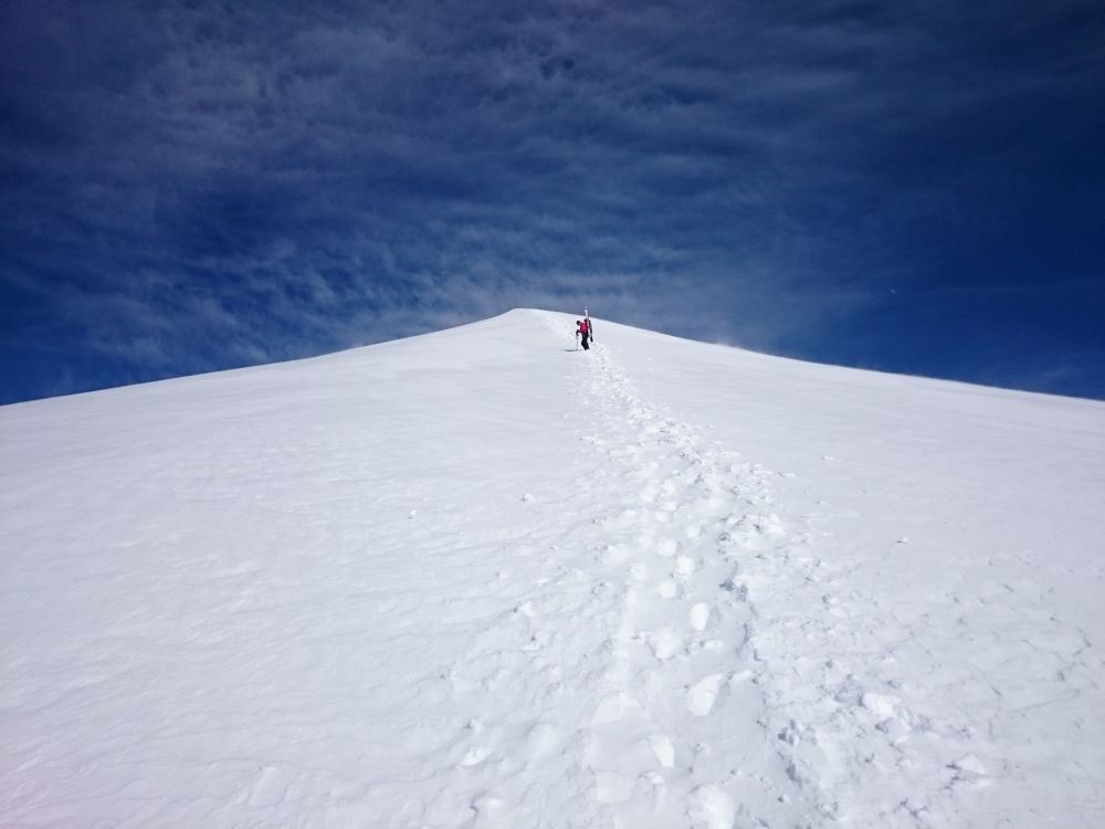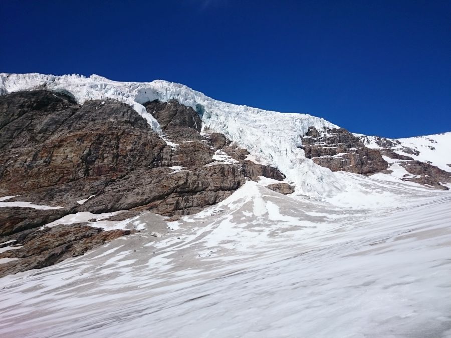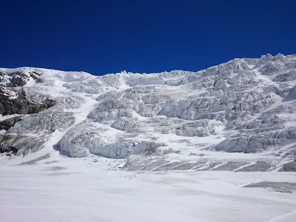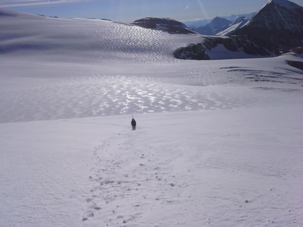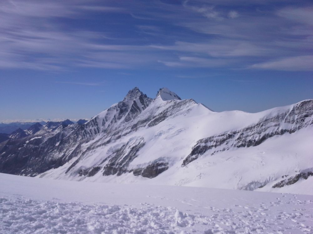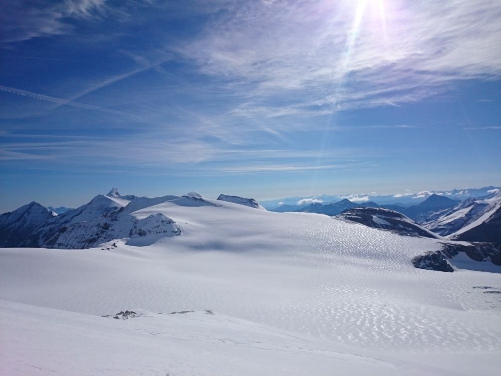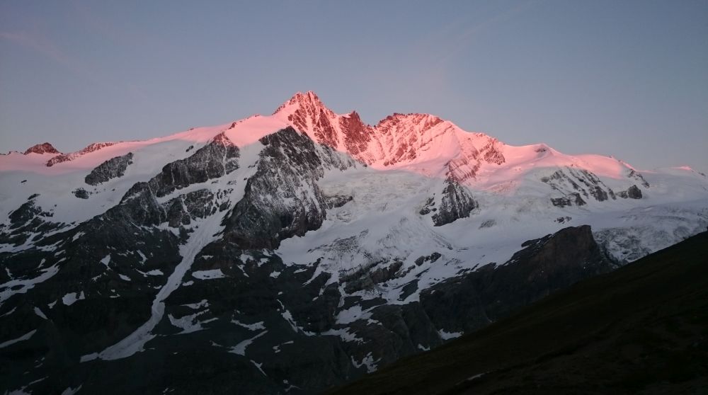 No in končno je prišel na vrsto spet Johannisberg vrh nad ledenikom Pastirci pod Velikim Klekom, če se izrazim izvorno. Tam sem bil prvič pred petimi leti, ko naju je z Samotom s seboj popeljal legendarni Rok Medja. Tokrat sva se odpeljala sama ni pa baje veliko manjkalo, da bi ga spet osvojili skupaj. Odrinila sva že dan poprej in seveda prespala oz. predremala v garažah na platoju. Se ve zakaj… tudi hitrost priprave na turo zjutraj je tako hitrejša, spočit pa ne greš na kar dolgo in položno pot. Ampak končna ocena današnje ture pa vse to odtehta, nasploh odločitev, da smučava direktno z vrha na ledenik je bila najboljša. Krenila sva ob pol petih z platoja in po urci hoje stopila na sneg. Temperatura se je s tem drastično znižala (-10 ob močnem vetru) in malo pred Oberwalderhutte (2973nm) se je Samo že močno podhlajen odločil, da ta dan vrha ne bo mogel osvojiti samo v majici Ljubljanskega maratona in z mojo pomočjo oblekel vse kar sva imela toplega s seboj. Ogrel se je šele tik pod vrhom, ki sva ga ob pol devetih že veselo občudovala in razglede okoli. Zgodnja ura in zares nizke temperature za ta letni čas pa še nekaj na novo zapadlega zbitega snega, sta namreč zagotavljala zares uživaško smučarijo. Tako sva kar hitro skočila na smuči, odsmučala na ravno prav mehki podlagi, direktno iz vrha proti vhodu na ledenik. Zaradi samega hitenja in brez ogrevanja, je meni kmalu postalo jasno, da se bom zopet boril z krči na stegenjskih mišicah. Temu je botroval tudi orenk trening CF-ja v torek, ko nas je Domen pošteno vzel v roke. Ampak po vstopu v strm del koluarja na vrhu Pastercov, časa za razmišljanje ni bilo več in tako so tudi krči postopoma izginili. Teren je bil mestoma poledenel, na sredini pa odličen in oprijemljiv in do ledeniške morene in ledu je bila smučarija perfektna. Pripeljala sva se še čisto do konca ledenika in moja prva misel je seveda bila, da sva pa že skoraj pri avtu. Na mojo žalost sem ugotovil, da je vzpon do garaž še kar dolg in naporen, vendar sva se lepo zamotila ob opazovanju označb o višini ledenika v preteklih letih. Res se hitro topi in čez nekaj časa, mogoče res ne bo več možno tu smučati ob tem letnem času. Uživala Rok in Samo