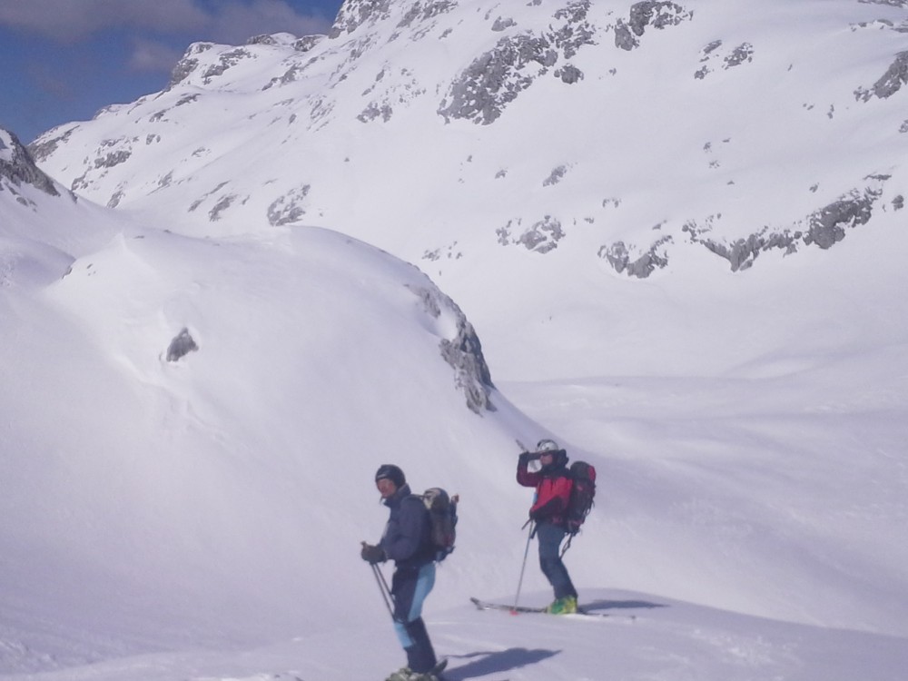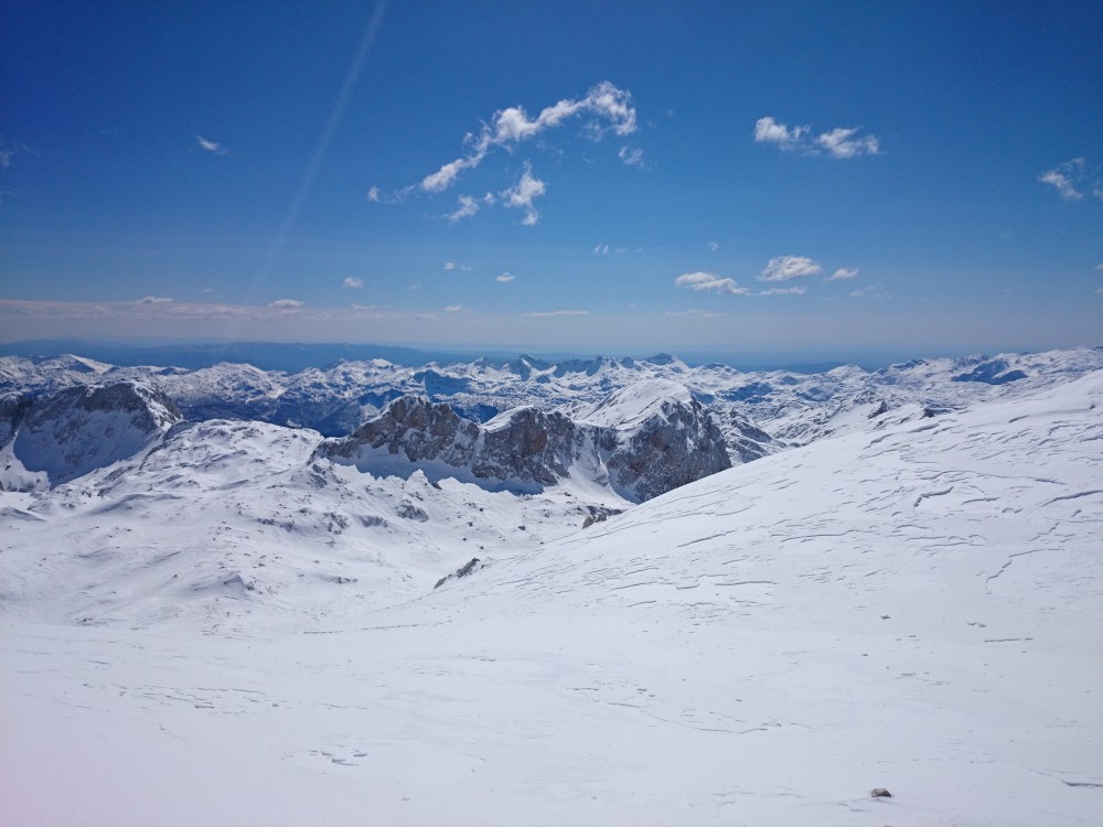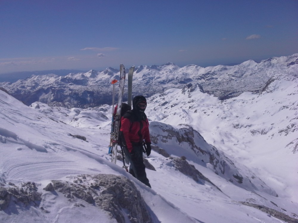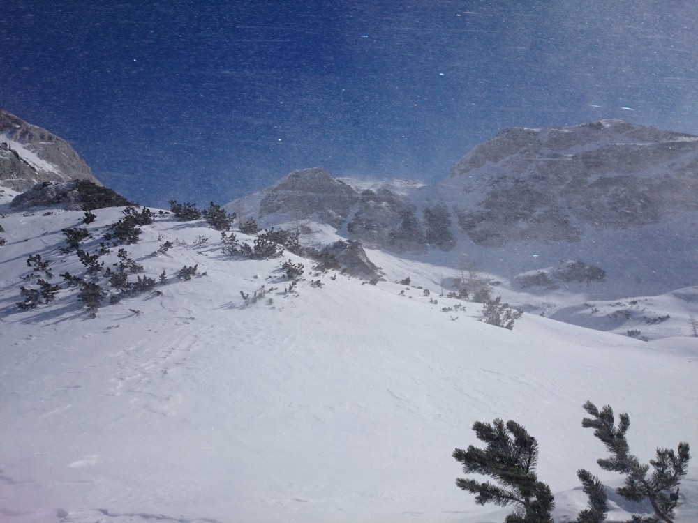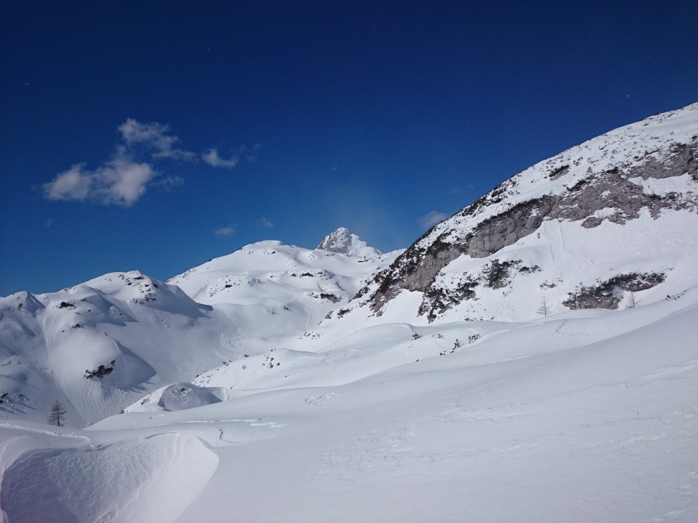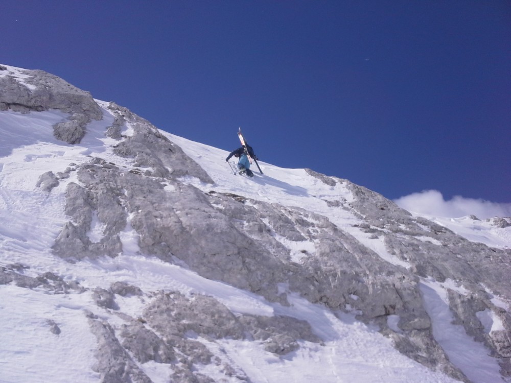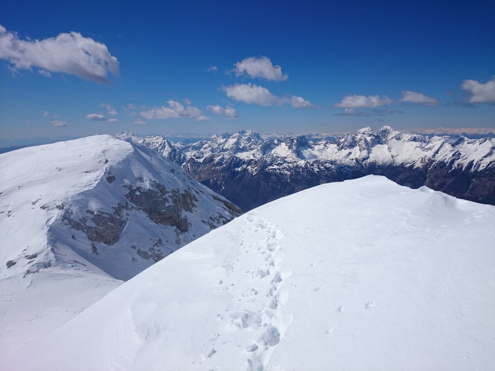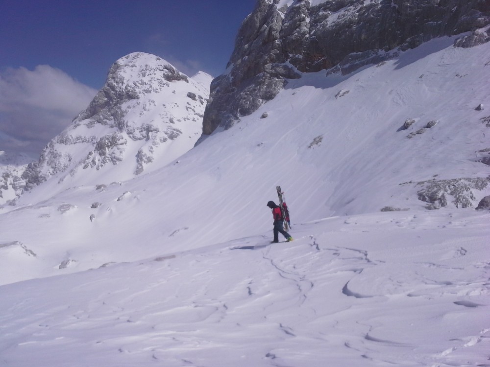 V Roku je že nekaj časa tlela ideja in želja po tem, da bi šli iz bohinjskega konca na Kanjavec in se smučali na Velo polje ter v Krmo. Včeraj smo se te kar dolge ture tudi lotili. Štartali smo na planini Blato, pri razcepu smo se odločili za pot preko Dednega polja in po dolini Za Kopico. Že na začetku nas je spremljal veter, vendar ga je gozd dokaj dobro ustavljal. Prvih dvajset minut hoje je bilo predvsem po kopnem, nato se je začela strnjena snežna odeja. Zaradi trde snežne odeje smo do Dednega Polja smuči nosili, nato pa smo kombinerali, saj je bilo na strmih počjih lažje peš. Pot smo nadeljeveli preko Zadnjega Vogla in ne preko Vrat. Tu je bil kar močan veter, ter premalo snežne odeje, tako smo iz Vogla sestopili z drezami in cepini. Kar v taki opravi smo prečili pod Vršake, kjer se je le malo preveč ugrezalo, tako da smo zlezli na smuči in se podali proti Hribaricam. S smučmi smo pririnili vse do sedelčka med obeme Kanjavcema, kjer je bil dokaj dober zaveterje, tako da smo se kar tu pripravili na spust. Zadnjo strmino vzhodnega vrha smo premagali peš. Pričakovali smo orkanski veter, pa ni bilo tako hudo. Vzeli smo si čas za neverjetne razglede. Vidlo se je morje, Marmolado in ostale Dolomite, visoke ture, Karavanke, Kamiške in Snežnik, skratka bila je res dobra vidljivost. Odsmučali smo v velsko dolino in do Velega Polja. Snežna podlaga je bila po večini trda vendar so robniki dobro držali. Na parih delih smo ujeli napihan pršič, ki je ponujal še dodaten užitek. Z Velega polja smo se kar peš povzpeli na Vratca in odsmučali proti Krmi. Do Zgornje Krme je bila smuka zelo dobra, nato je sledil simpatičen rodeo vse Pleše, kjer smo po levi obšli borovce. V gozdu je spet sledil rodeo. Približno 100 višinskih metrov pred Gražami smo dali smuči na nahrbtnik. Nabralo se je preko 1700 višnskih metrov smučanja. Lepa in razgledna tura.