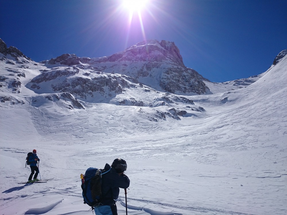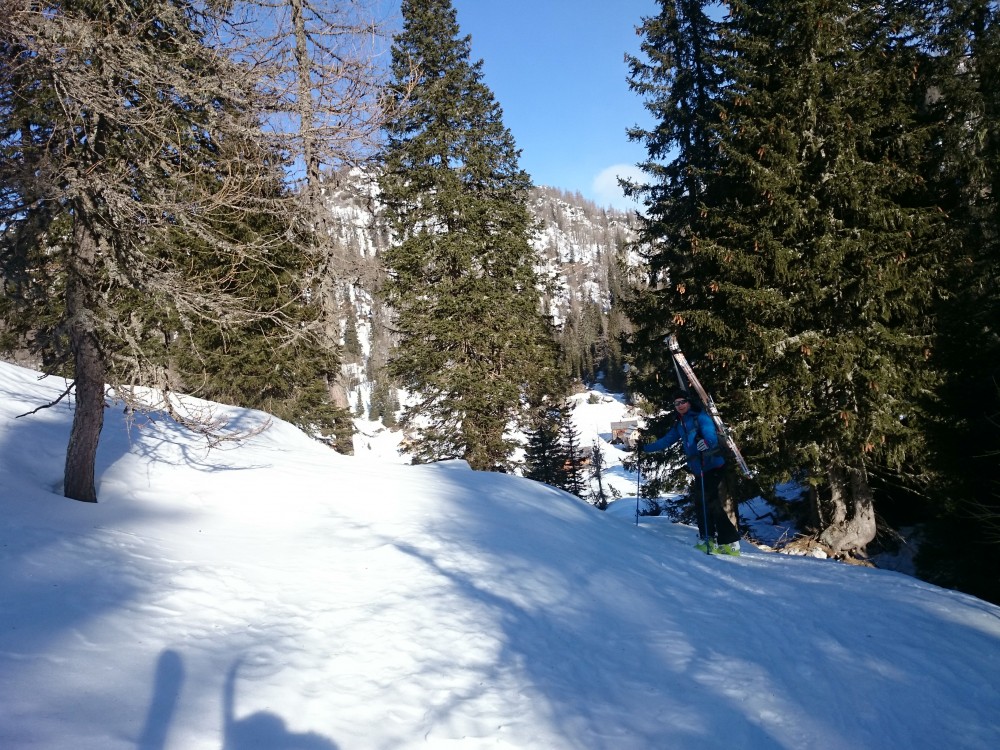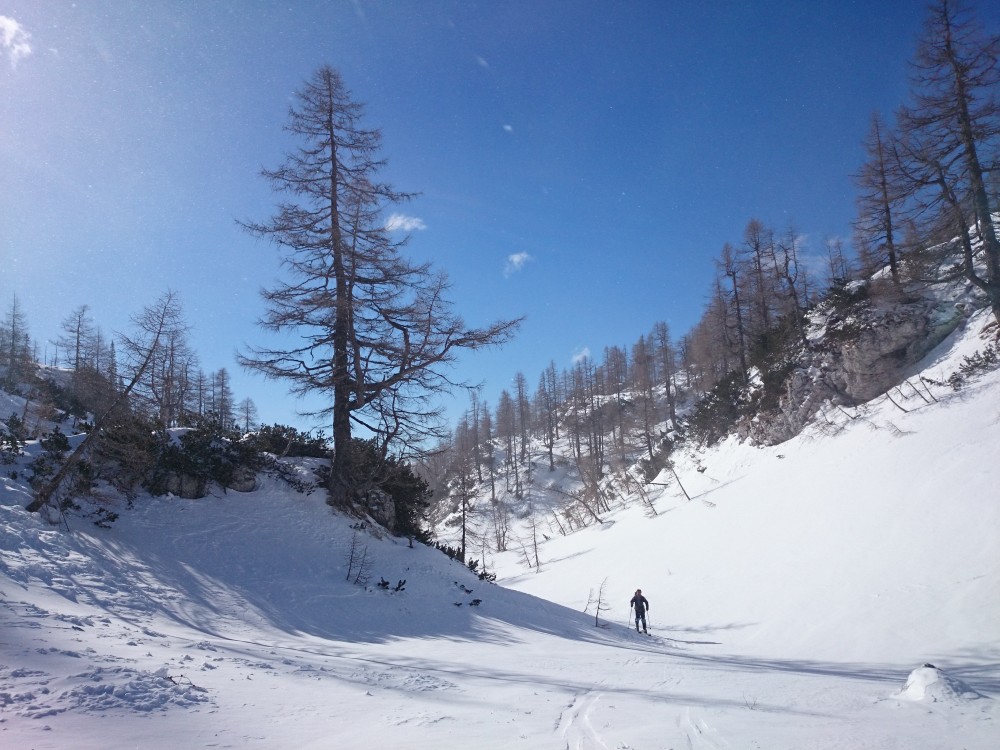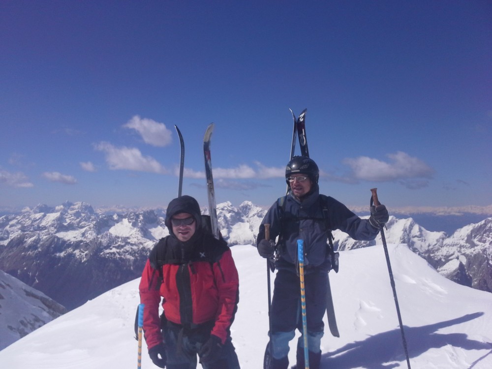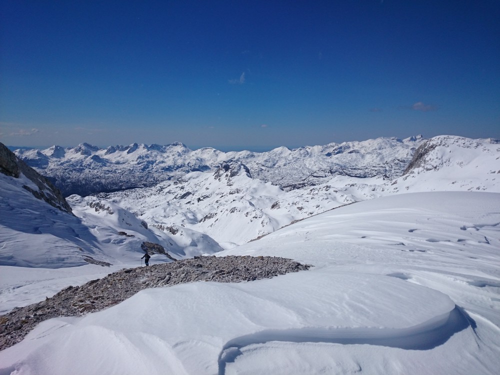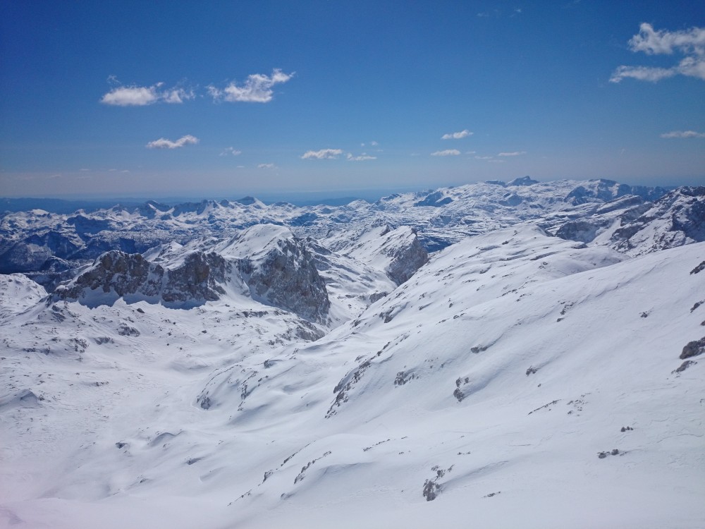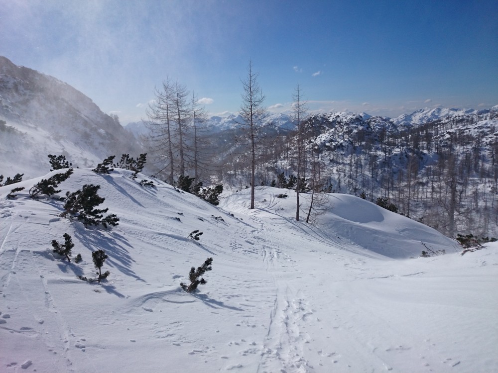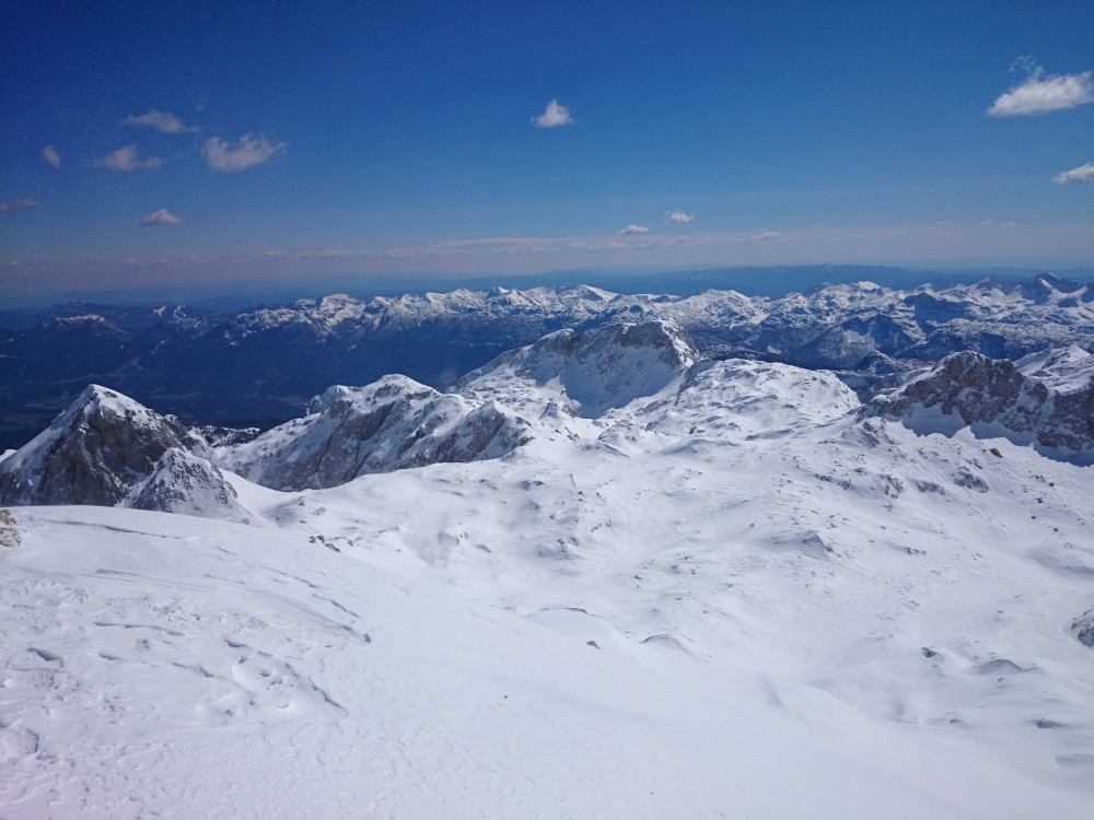 V Roku je že nekaj časa tlela ideja in želja po tem, da bi šli iz bohinjskega konca na Kanjavec in se smučali na Velo polje ter v Krmo. Včeraj smo se te kar dolge ture tudi lotili. Štartali smo na planini Blato, pri razcepu smo se odločili za pot preko Dednega polja in po dolini Za Kopico. Že na začetku nas je spremljal veter, vendar ga je gozd dokaj dobro ustavljal. Prvih dvajset minut hoje je bilo predvsem po kopnem, nato se je začela strnjena snežna odeja. Zaradi trde snežne odeje smo do Dednega Polja smuči nosili, nato pa smo kombinerali, saj je bilo na strmih počjih lažje peš. Pot smo nadeljeveli preko Zadnjega Vogla in ne preko Vrat. Tu je bil kar močan veter, ter premalo snežne odeje, tako smo iz Vogla sestopili z drezami in cepini. Kar v taki opravi smo prečili pod Vršake, kjer se je le malo preveč ugrezalo, tako da smo zlezli na smuči in se podali proti Hribaricam. S smučmi smo pririnili vse do sedelčka med obeme Kanjavcema, kjer je bil dokaj dober zaveterje, tako da smo se kar tu pripravili na spust. Zadnjo strmino vzhodnega vrha smo premagali peš. Pričakovali smo orkanski veter, pa ni bilo tako hudo. Vzeli smo si čas za neverjetne razglede. Vidlo se je morje, Marmolado in ostale Dolomite, visoke ture, Karavanke, Kamiške in Snežnik, skratka bila je res dobra vidljivost. Odsmučali smo v velsko dolino in do Velega Polja. Snežna podlaga je bila po večini trda vendar so robniki dobro držali. Na parih delih smo ujeli napihan pršič, ki je ponujal še dodaten užitek. Z Velega polja smo se kar peš povzpeli na Vratca in odsmučali proti Krmi. Do Zgornje Krme je bila smuka zelo dobra, nato je sledil simpatičen rodeo vse Pleše, kjer smo po levi obšli borovce. V gozdu je spet sledil rodeo. Približno 100 višinskih metrov pred Gražami smo dali smuči na nahrbtnik. Nabralo se je preko 1700 višnskih metrov smučanja. Lepa in razgledna tura.