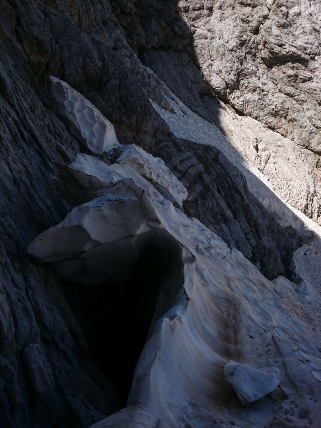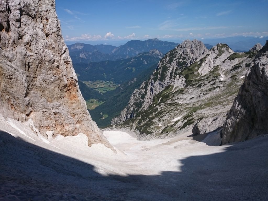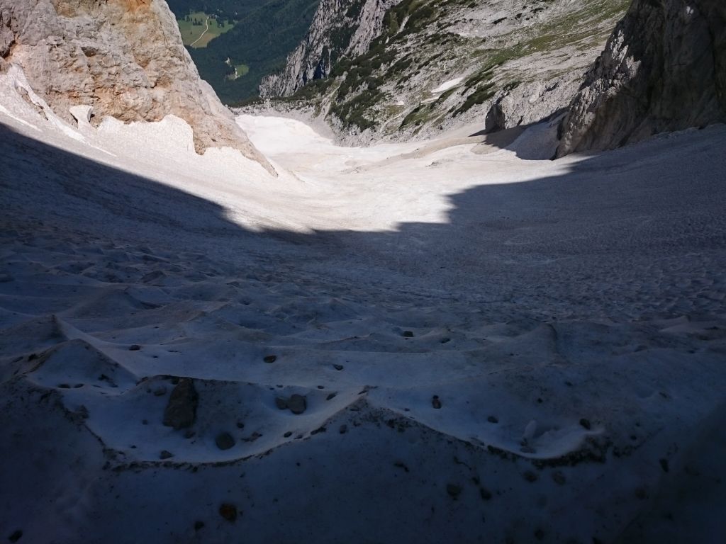 Včeraj sem šel pogledati na Ledenik pod Skuto in se kar solidno nasmučal. Še vedano je povsem povezanih dobrih 400 višinskih metrov snežiša. Od stene pa vse do približno 100 višnskih metrov nižje malo moti kamenje. Sneg je že povsem predelan in zbit, poleg tega so luknje oziroma valovi, tako da je smučanje kar dober trening za noge. Sicer je bil že zjutraj na vrhu kakšen centimeter mehak južen sneg, vendar je bilo smučanje najboljše zadnjo rundo, okoli 12:30, ko je sonce dodato vsaj malobolj zmehčalo sneg. Trikrat sem vse skupaj ponovil, tako da se je nabralo približno 1200 višnskih metrov smučanja. Povezava bo ostala še morda kakšen teden, nato bo ena prekinitev. Pristopil in sestopil sem po Lovski poti, tako da nisem videl snežišča pod žrelom. Glede na prejšnja leta pa predvidevam, da je tam kar veliko kamenja.