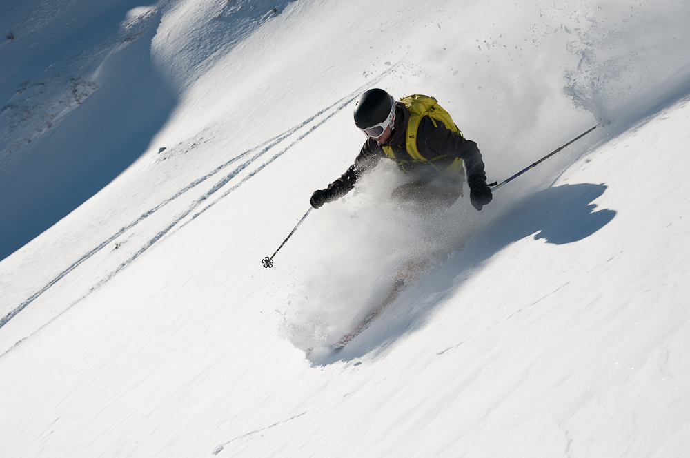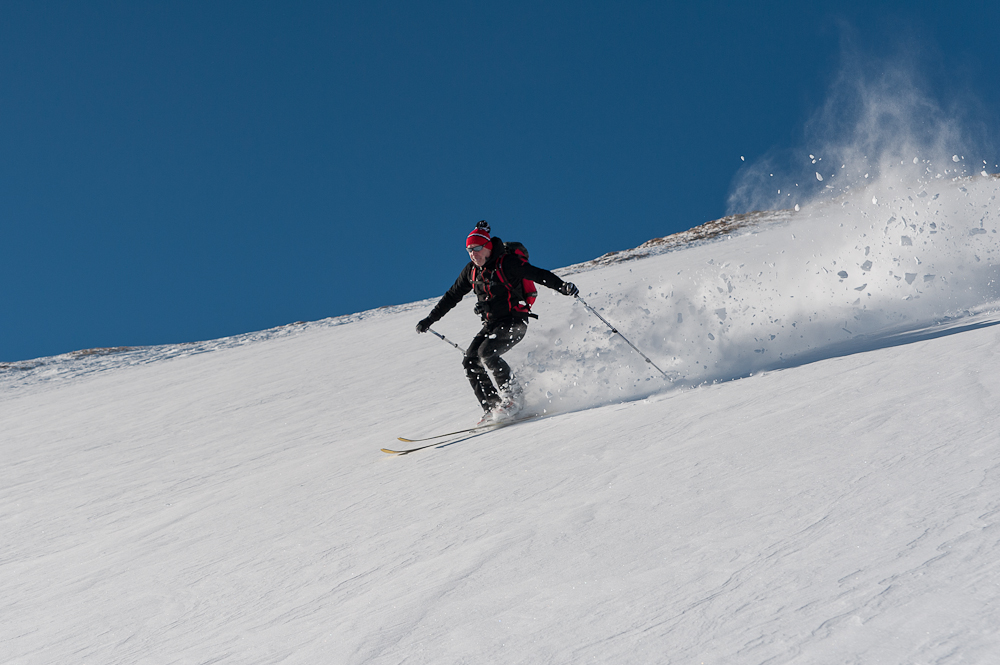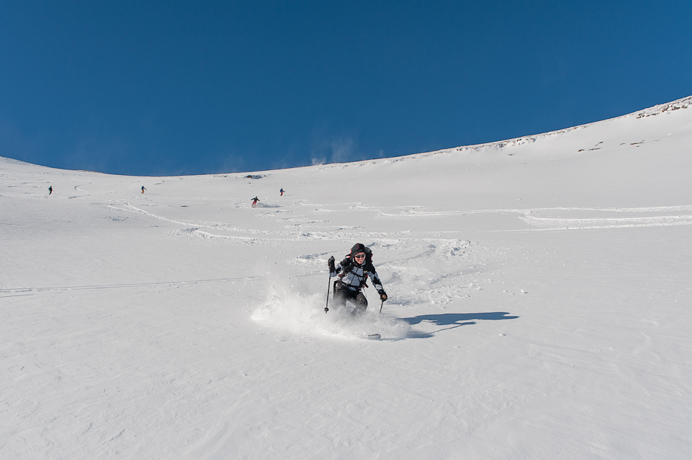 Sledil je vrhunski spust po dokaj strmem in dolgem pobočju, na jugovzhodni del Poisniga,ki je bil glede na snežne razmere v okolici, lepo zalit. Še enkrat se je pokazalo,da ima naš Jure res nos oziroma znanje, kje najti pršič, kajti letos še nismo smučali izven pršiča, kljub slabi zimi za turno smuko. Po krajšem počitku na planoti, sledi montiranje kož na naše smuči in spet se poženemo v hrib proti sedlu Torscharte, kjer potem zavijemo levo proti vrhu Stubecka.