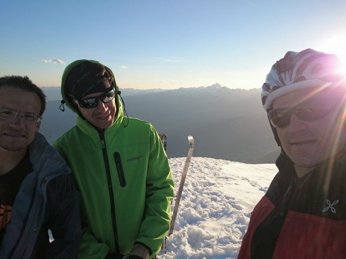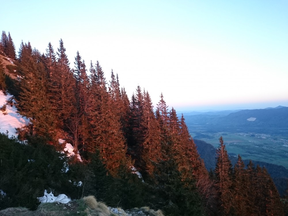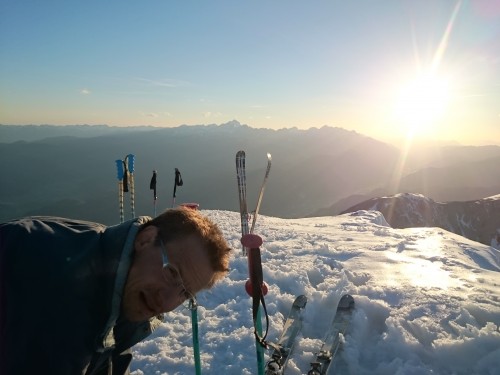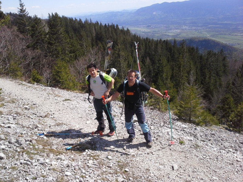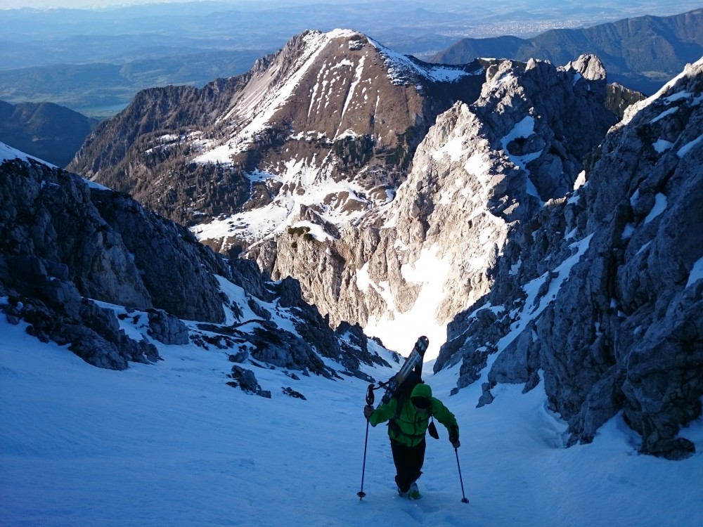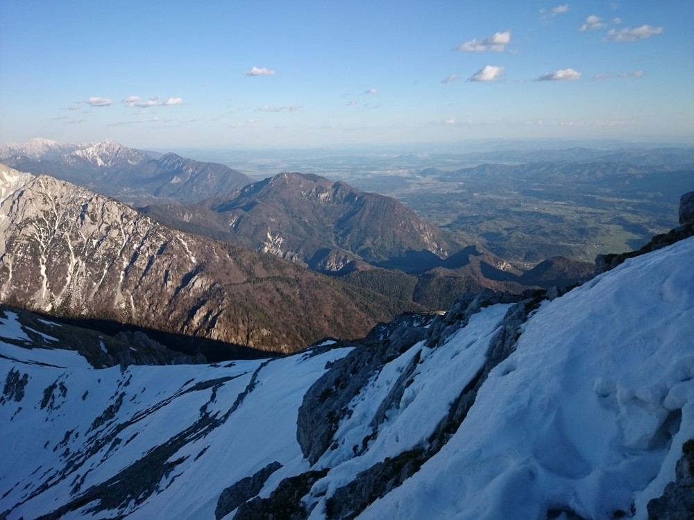 Včeraj pa smo se odločili za, po-službeni popoldanski Stol, saj so dnevi dolgi, sneg pa dovolj predelan. Ob 15h smo štartali pri Valvazorju in jo mahnili skoraj na vrh. Do višine približno 1800m smo smuči in pancarje nosili, nato smo se preobuli. Na sedelcu smo se spustili proti dolini Orlice, kjer je bila res dobra smučarija. Ko se je malo položilo,smo prečili proti Janeževem žlebu. Malo vzpona in bili smo na Stolovi škrbini, kjer smo se spustili v žleb,na Avstrijsko stran, kjer je bil sneg, prav tako dober za smučanje. Ker nas je čas preganjal, smo ga presmučali le približno 300 višinskih metrov. Spet smuči na ramo in nazaj ,tokrat na vrh Stola. Na vrhu smo opazovali neverjetno večerno svetlobo in razgled, ki je segal vse naokrog. Navadno dopoldan ni takih razgledov predvsem v dolino, saj je megla ali so meglice. Tokrat je res bilo vse čisto. Odsmučali smo po grapi proti Prižnici, kjer smo tudi zaključili s smučanjem. Smuka je bila odlična! Tu smo se preobuli in odpeketali proti avtu. Strinjali smo se, da je bila super tura, ki nam je ponudila skoraj 1000 višinskih metrov smučanja in približno 1400 višinskih metrov skupno. Do avta smo prišli, ravno tako, da še nismo rabili svetilk.