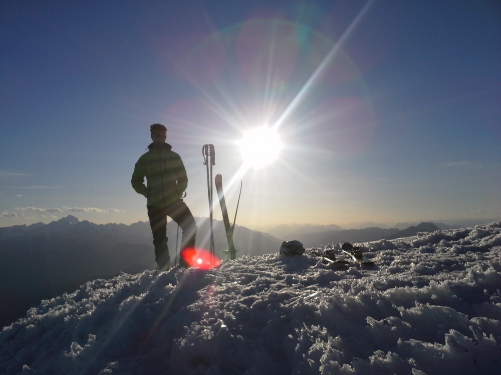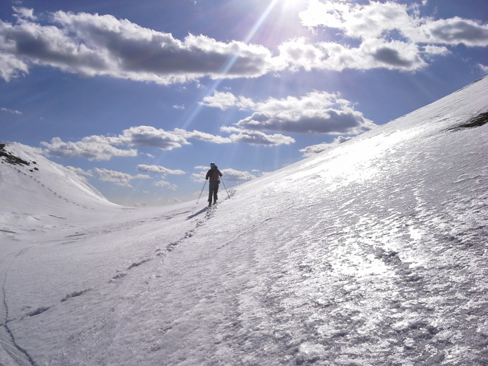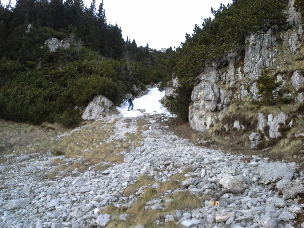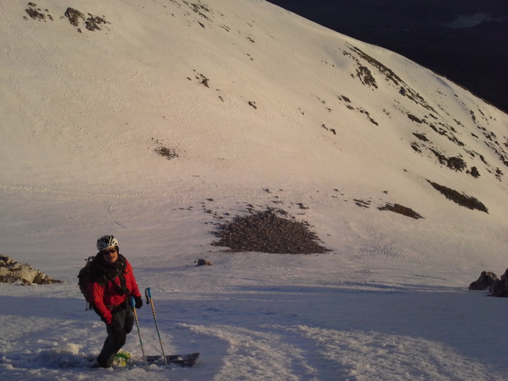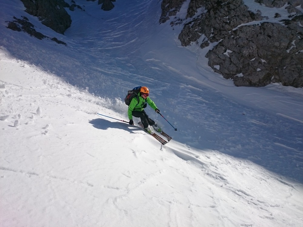 Včeraj pa smo se odločili za, po-službeni popoldanski Stol, saj so dnevi dolgi, sneg pa dovolj predelan. Ob 15h smo štartali pri Valvazorju in jo mahnili skoraj na vrh. Do višine približno 1800m smo smuči in pancarje nosili, nato smo se preobuli. Na sedelcu smo se spustili proti dolini Orlice, kjer je bila res dobra smučarija. Ko se je malo položilo,smo prečili proti Janeževem žlebu. Malo vzpona in bili smo na Stolovi škrbini, kjer smo se spustili v žleb,na Avstrijsko stran, kjer je bil sneg, prav tako dober za smučanje. Ker nas je čas preganjal, smo ga presmučali le približno 300 višinskih metrov. Spet smuči na ramo in nazaj ,tokrat na vrh Stola. Na vrhu smo opazovali neverjetno večerno svetlobo in razgled, ki je segal vse naokrog. Navadno dopoldan ni takih razgledov predvsem v dolino, saj je megla ali so meglice. Tokrat je res bilo vse čisto. Odsmučali smo po grapi proti Prižnici, kjer smo tudi zaključili s smučanjem. Smuka je bila odlična! Tu smo se preobuli in odpeketali proti avtu. Strinjali smo se, da je bila super tura, ki nam je ponudila skoraj 1000 višinskih metrov smučanja in približno 1400 višinskih metrov skupno. Do avta smo prišli, ravno tako, da še nismo rabili svetilk.