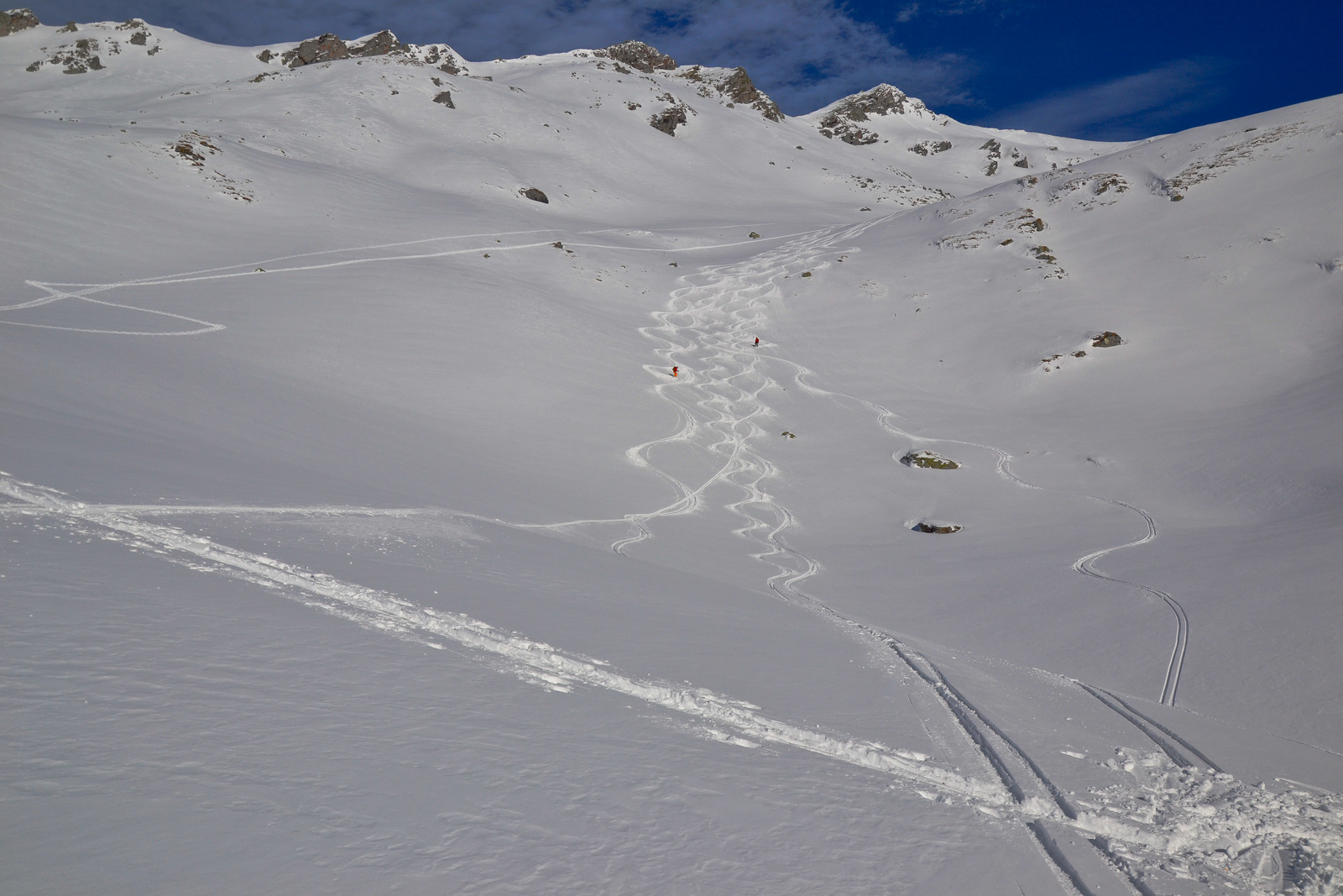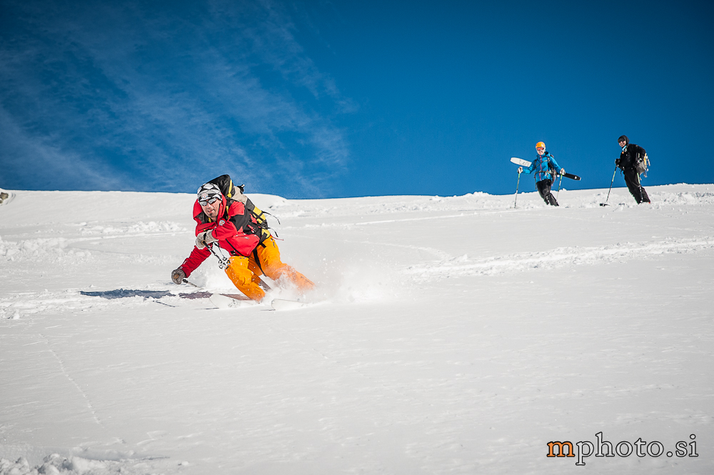 Rok je zrihtal na test Dynafitove dile, jaz lokacijo, Samo prevoz, Miro fotke, Atila pa se je hotel imeti fajn. Tako smo sprva šli proti Sadnighausu, vendar Ari Vatanen alias Samo ni zvozil vseh ovinkov. Na hitro sprememba plana in gremo na proti Jamnigalmu. Prevoz do planine za 5 eur. Se splača, potem pa gaženje do vrha z nasmehi na obrazu. Razmere krasne, cca 120 km iz Jesenic.