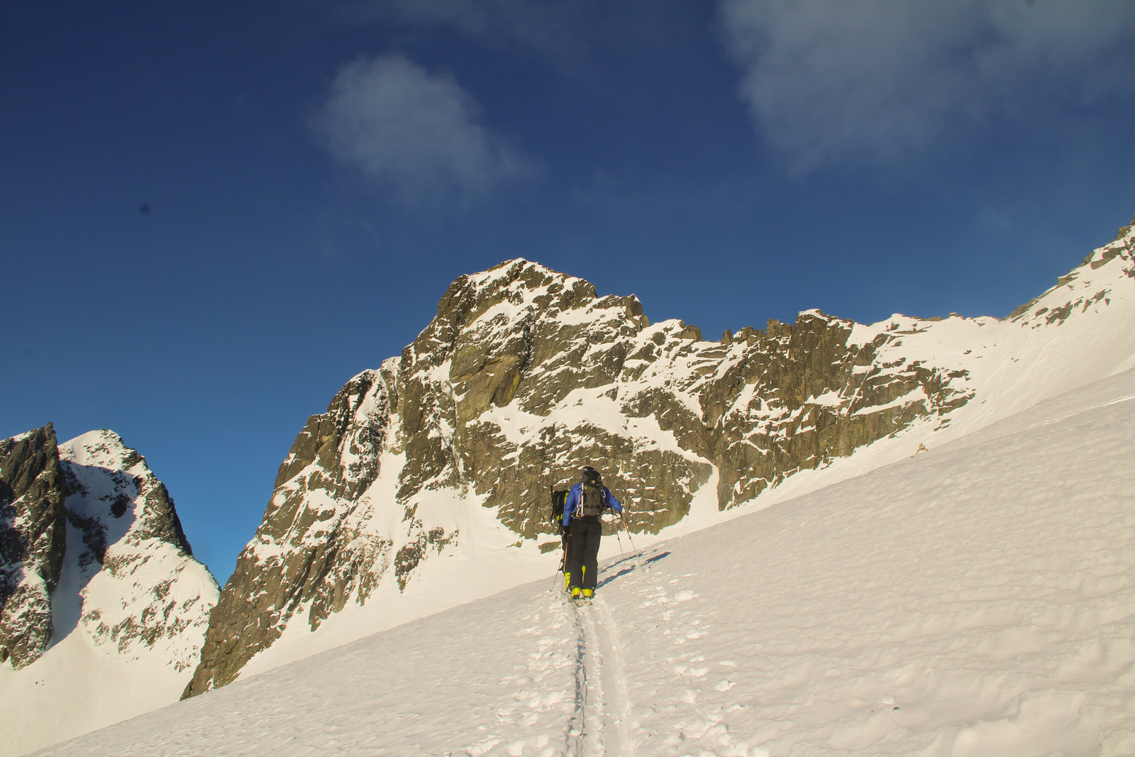 Od ideje do izvedbe našega tripa ni minilo veliko, ampak taka ekipa ne rabi veliko. Vsak svojo vlogo naredil in že smo se v sredo popoldne nabrali in odpeljali proti Slovaški, visoke Tatre. Iva in Vlado sta nama rezervirala bajto in app v dolini. Pozno ponoči smo prispeli v Tatransko Lomnico, cca 830km iz Kranja. Zjutraj štart z vlakcem do 1200m visoko razgledno točno Hribenok za 8eur 300vm 4 km. Potem se je pričel pristopni marš do Zbojničke Chate. Že v dolini smo se dobili s Ivo in Vladom. Vsak svoj tempo. Nedolgo pod kočo mi pogled uide desno in glej popoln koluar zgažen. Na ves glas se derem Borčiju a grevaaaaaaaaaa. Borči kot Borči ko ga je videl sva že gazila v pršič do vstopa. Z druge strani sta prišla še Iva in Vlado. Na koncu se je izkazalo, da je žleba skoraj 800m. Nikol konca. Na vrhu pa par fotk potem pa gas v dolino. Sneg od rahlo ojuženega do popolnega pršiča. Sledil je še zadnjih 300m do koče, kjer pač je bilo treba proslaviti lep spust. Naslednji dan smo se zbudili v krasno jutro in že smo spet maširali z rahlim glavobolom proti Priečnem sedlu. Sledil je strm spust do Teycho chate. Tam se poslovimo od Slovaških prijateljev in že spet hodimo proti Baranye Rohy, krasen vrh iz katerega sem že smučal. Desno od njega pa deviški koluar. Spet ni bilo treba Borčija preprečevat in ponovila sva vajo prejšnjega dne. 400m žleb Stišskega štit naklonina 48 stopinj največ. Previdno odsmučava in se dobimo s ostalo ekipo pod sedlom. Skupaj zagazimo oz Milan bolj kot ostali nazaj na sedlo in do koče. Večer je minil mirneje. 3 dan smo prvo odšli na sonček odsmučat lep kucl Svištovy Stit. Odločimo se za senco in spet Milan gazi na sedlo Prielom. Popolno flanko razdevičimo totalno. Ker nam ni bilo dosti smo odšli še na Hranato vežo in Svištovo sedlo. Zaključili smo spet dan s 1300vm smučanja. Zadnji dan samo še kratka flanka, odsmučali v dolino in kava ter vožnja nazaj v Slo. Zaključek.. V Tatrah sem bil že 3x in še se bom vrnil. Ponujajo vse od strmih žlebov, flank, krasnih koč v visokogorju, prijaznih ljudi. Uživali jure, Igor, Borči, Slavc, Tuši, Stojan in Milan.